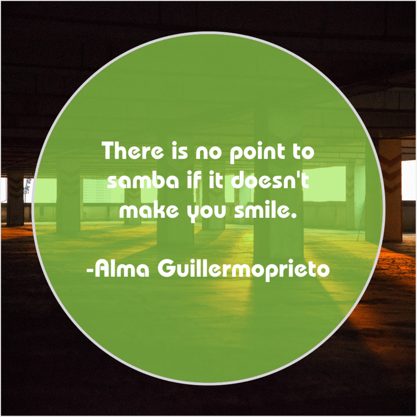 Alma Guillermoprieto Alma Guillermoprieto – There is no point to… May 4, 2019 admin “There is no point to samba if it doesn’t make you smile.”-Alma Guillermoprieto