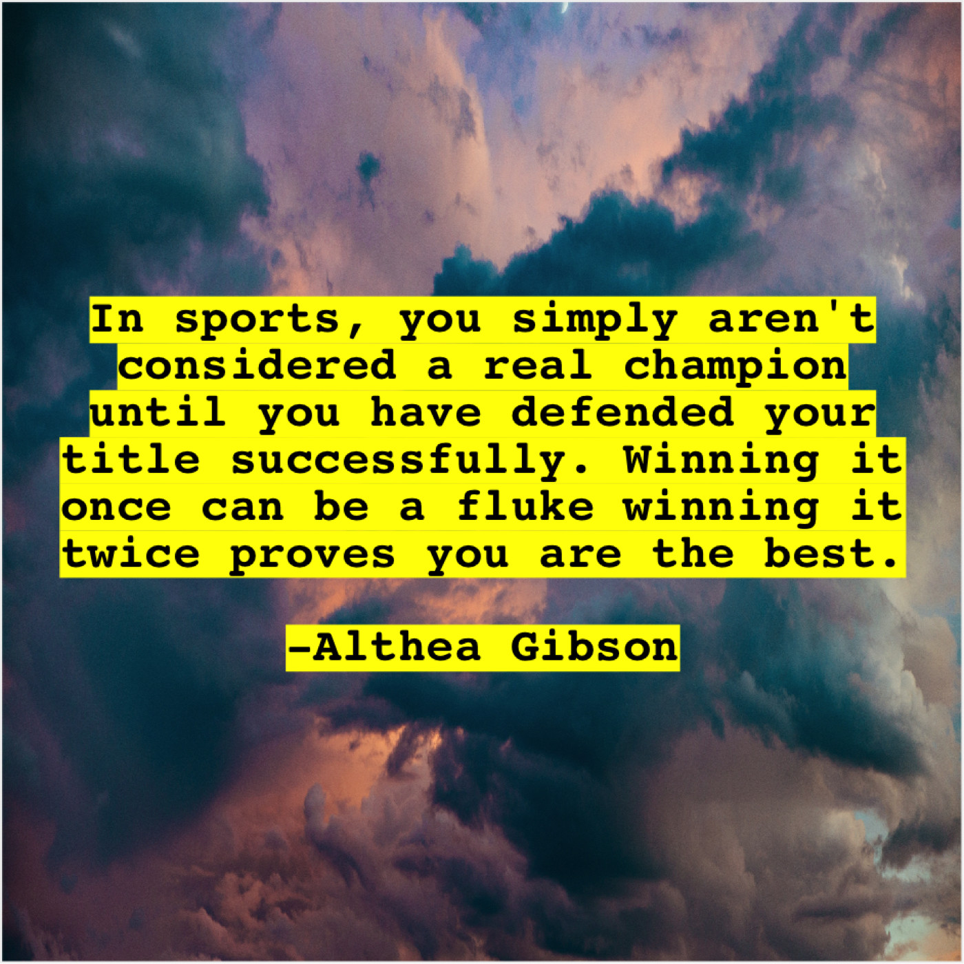 Althea Gibson Althea Gibson – In sports, you simply aren’t… August 10, 2019 admin “In sports, you simply aren’t considered a real champion until you have defended your title successfully. Winning it once can be a fluke winning it twice proves you are the best.”-Althea Gibson
