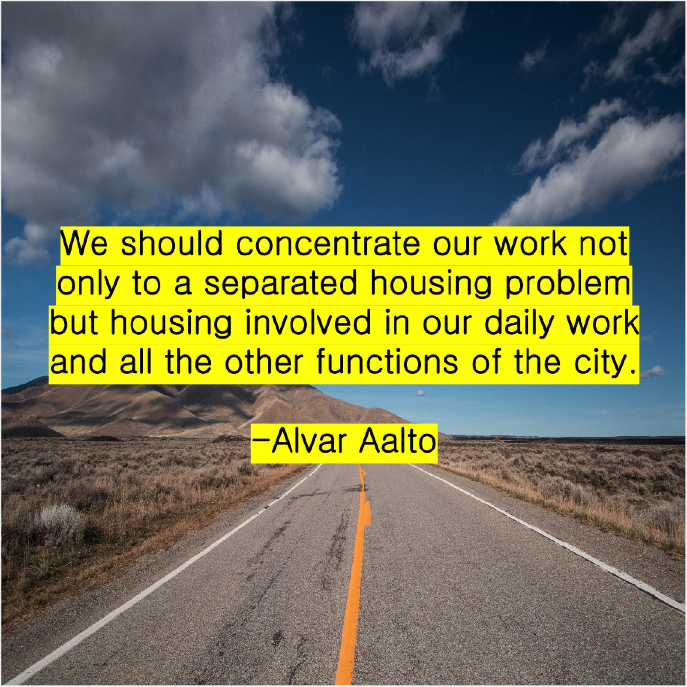 Alvar Aalto Alvar Aalto – We should concentrate our work… November 14, 2018 admin “We should concentrate our work not only to a separated housing problem but housing involved in our daily work and all the other functions of the city.”-Alvar Aalto