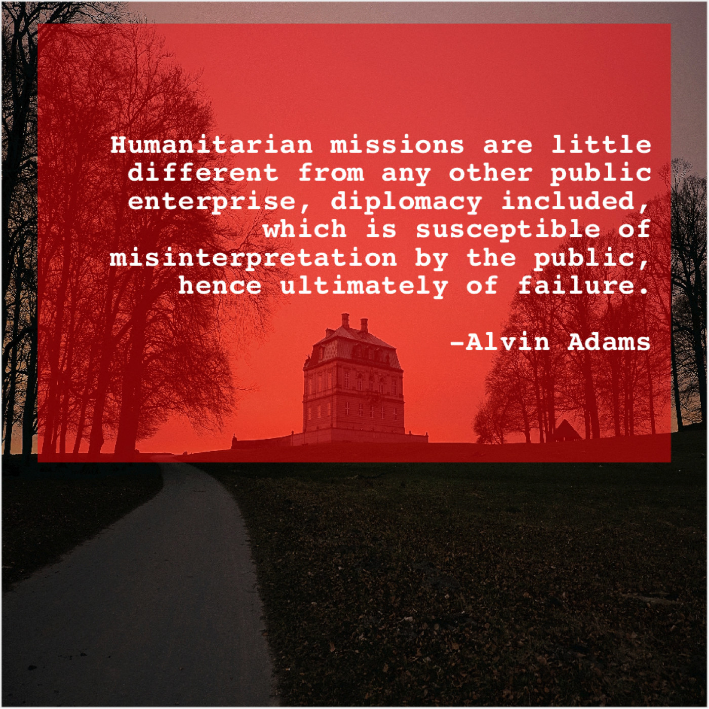 Alvin Adams Alvin Adams – Humanitarian missions are little different… August 7, 2019 admin “Humanitarian missions are little different from any other public enterprise, diplomacy included, which is susceptible of misinterpretation by the public, hence ultimately of failure.”-Alvin Adams