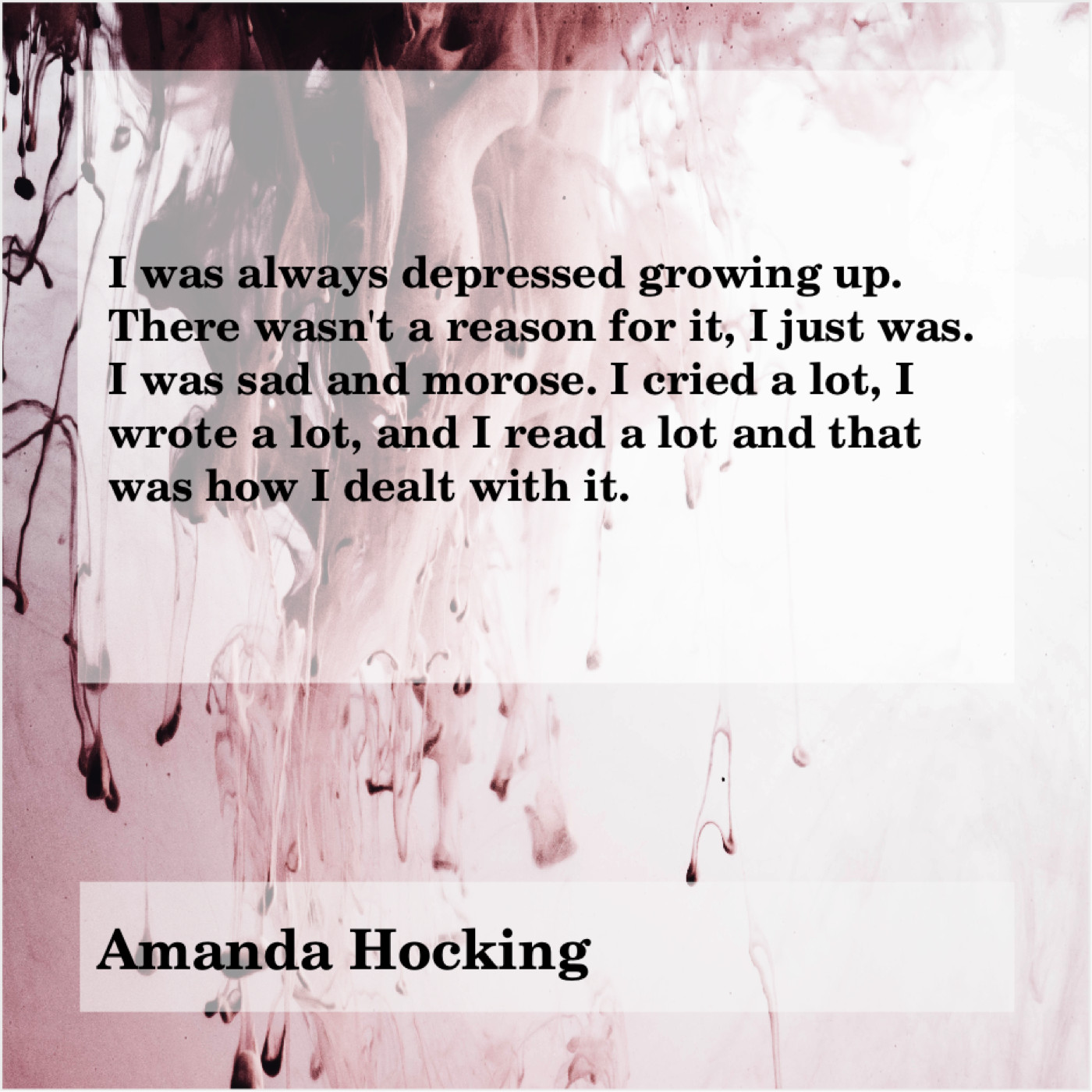 Amanda Hocking Amanda Hocking – I was always depressed growing… September 1, 2019 admin “I was always depressed growing up. There wasn’t a reason for it, I just was. I was sad and morose. I cried a lot, I wrote a lot, and I read a lot and that was how I dealt with it.”-Amanda Hocking