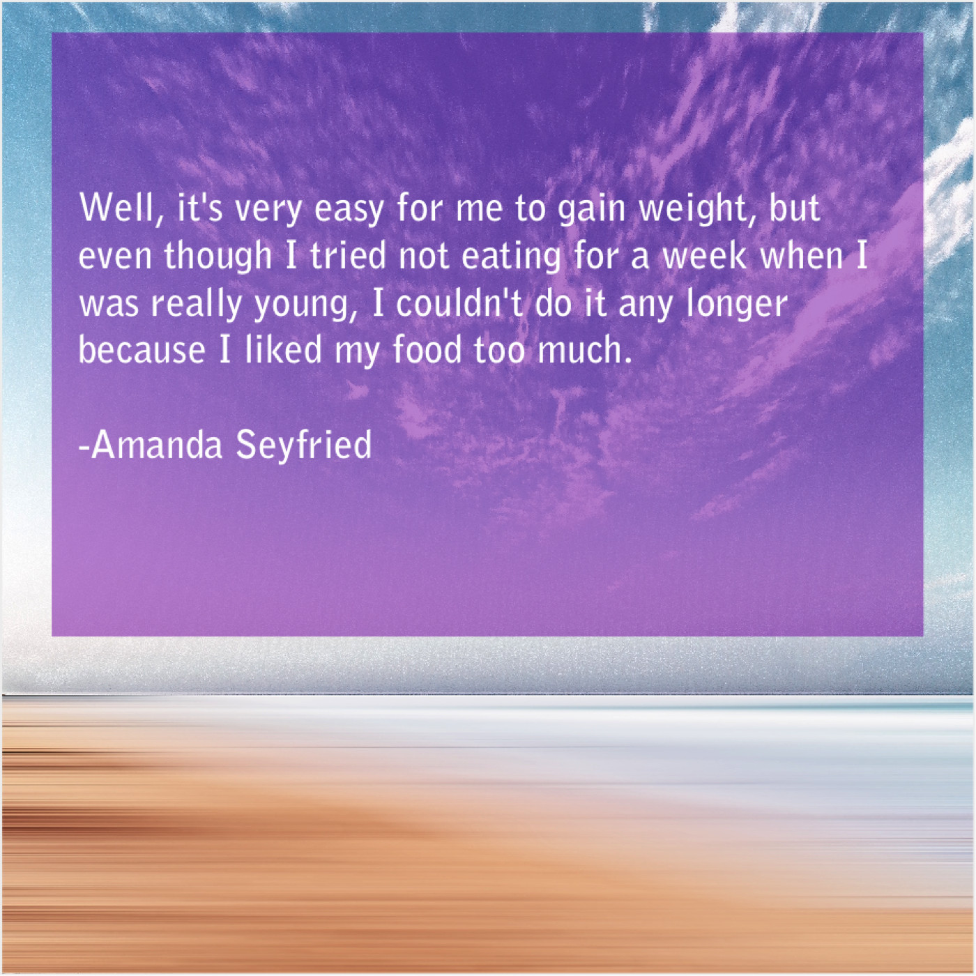 Amanda Seyfried Amanda Seyfried – Well, it’s very easy for… November 10, 2018 admin “Well, it’s very easy for me to gain weight, but even though I tried not eating for a week when I was really young, I couldn’t do it any longer because I liked my food too much.”-Amanda Seyfried