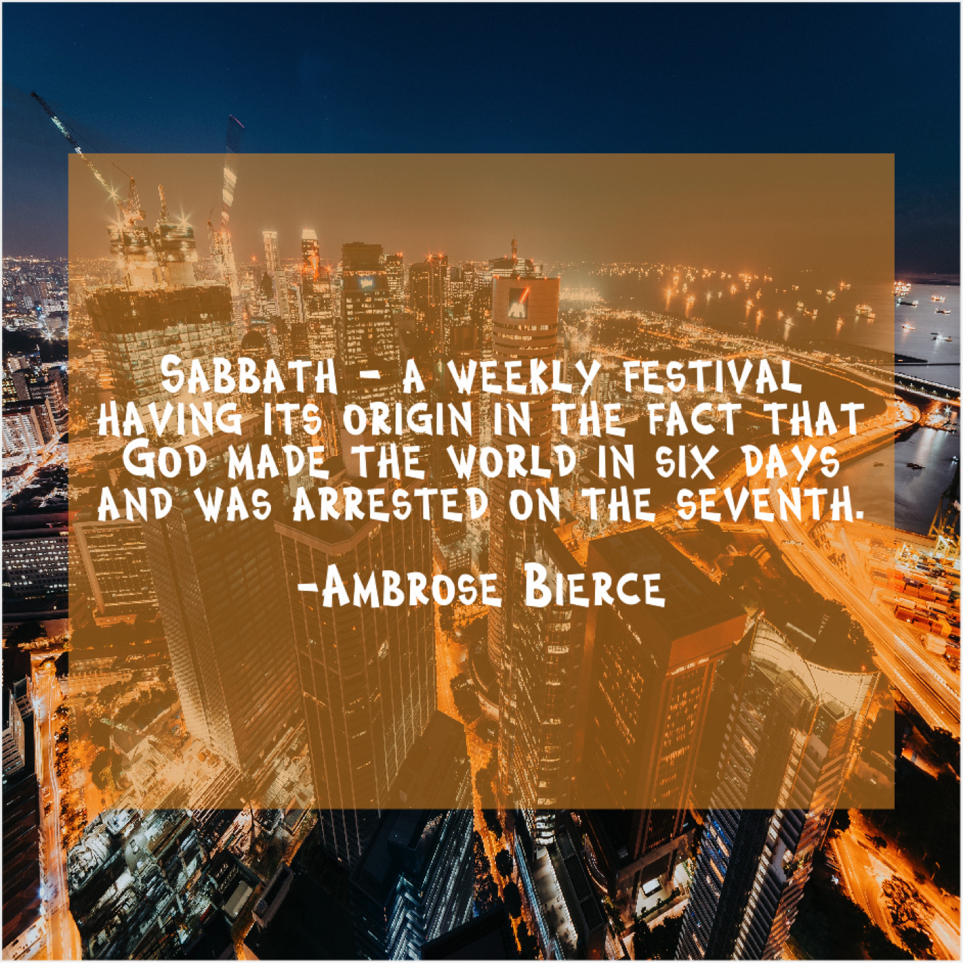 Ambrose Bierce Ambrose Bierce – Sabbath – a weekly festival having… July 6, 2019 admin “Sabbath – a weekly festival having its origin in the fact that God made the world in six days and was arrested on the seventh.”-Ambrose Bierce