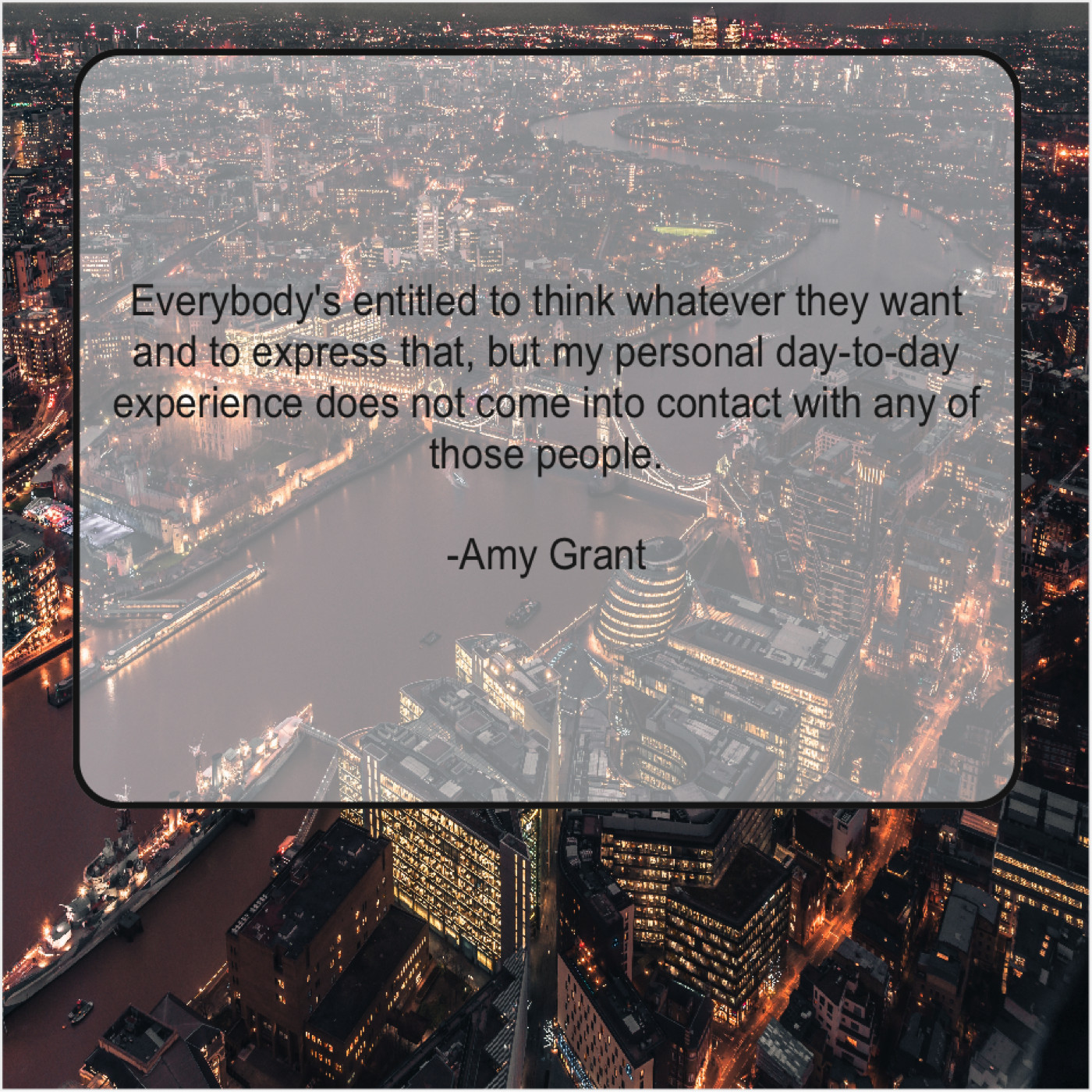 Amy Grant Amy Grant – Everybody’s entitled to think whatever… August 15, 2019 admin “Everybody’s entitled to think whatever they want and to express that, but my personal day-to-day experience does not come into contact with any of those people.”-Amy Grant