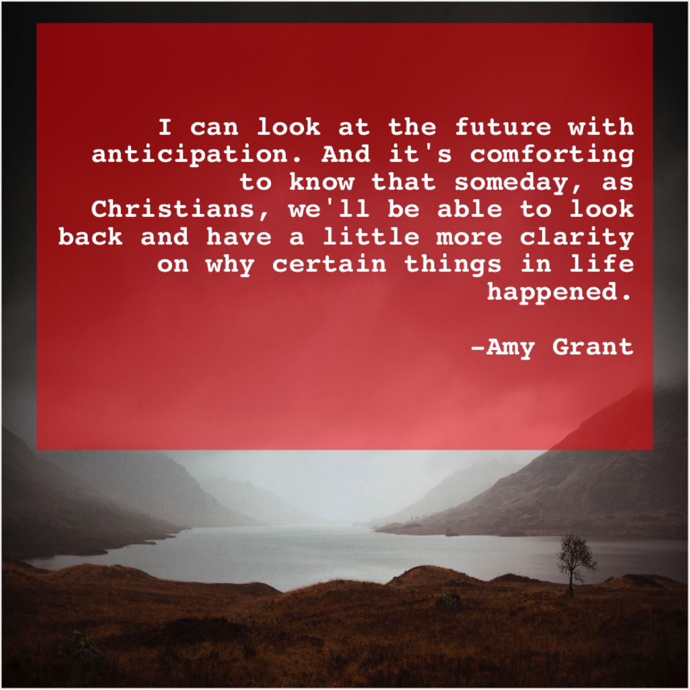 Amy Grant Amy Grant – I can look at the… June 27, 2019 admin “I can look at the future with anticipation. And it’s comforting to know that someday, as Christians, we’ll be able to look back and have a little more clarity on why certain things in life happened.”-Amy Grant