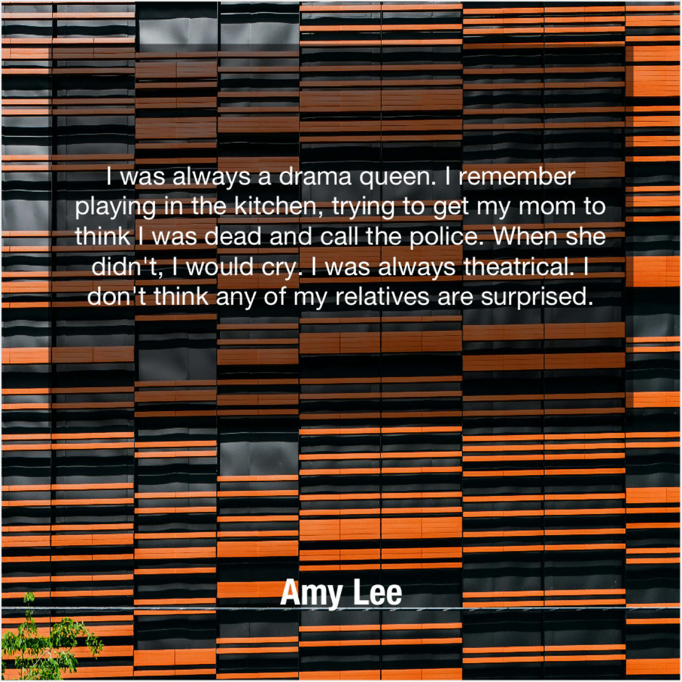 Amy Lee Amy Lee – I was always a drama… November 18, 2018 admin “I was always a drama queen. I remember playing in the kitchen, trying to get my mom to think I was dead and call the police. When she didn’t, I would cry. I was always theatrical. I don’t think any of my relatives are surprised.”-Amy Lee