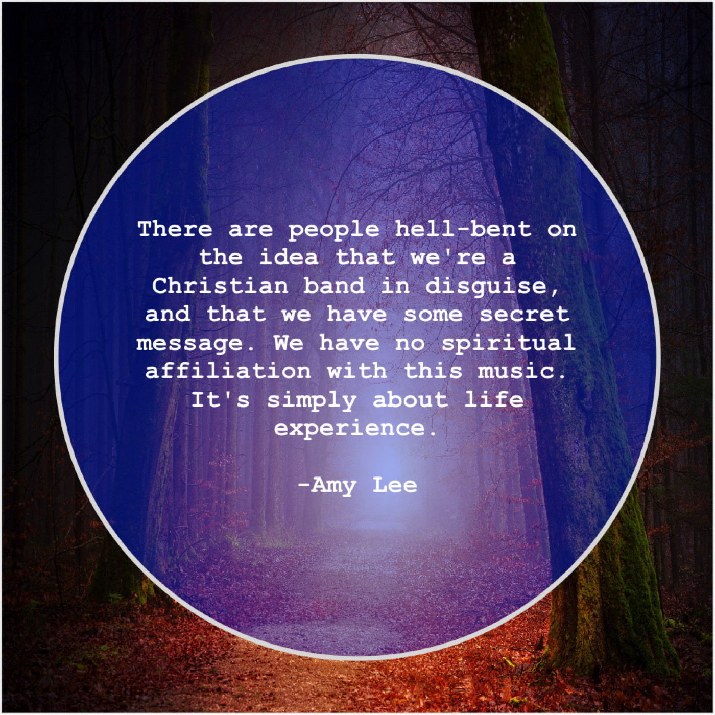 Amy Lee Amy Lee – There are people hell-bent… August 3, 2019 admin “There are people hell-bent on the idea that we’re a Christian band in disguise, and that we have some secret message. We have no spiritual affiliation with this music. It’s simply about life experience.”-Amy Lee