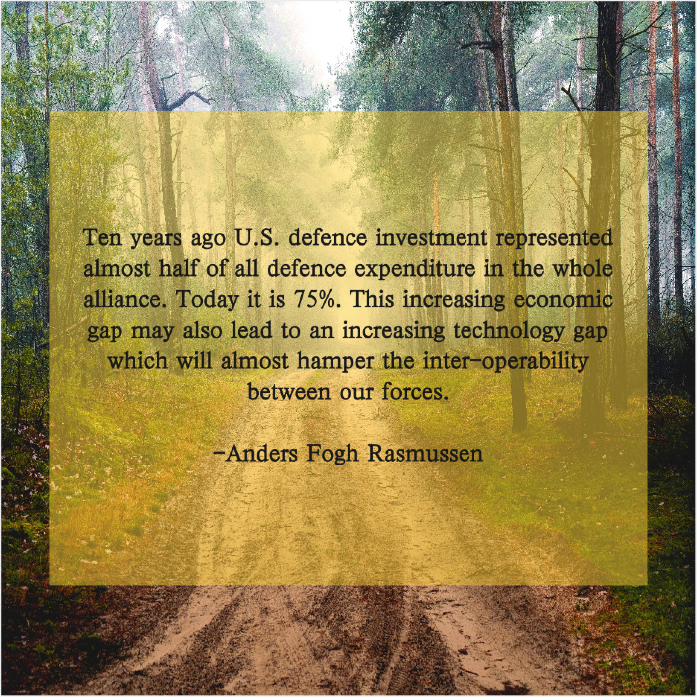 “Ten years ago U.S. defence investment represented almost half of all defence expenditure in the whole alliance. Today it is 75%. This increasing economic gap may also lead to an increasing technology gap which will almost hamper the inter-operability between our forces.”