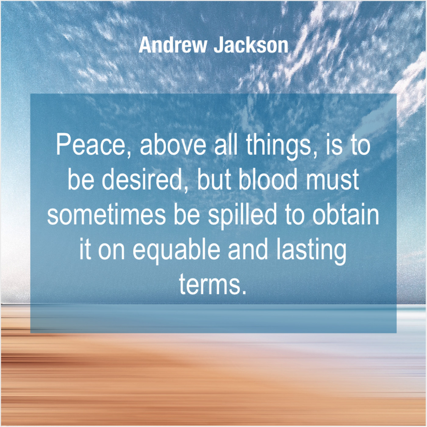 Andrew Jackson Andrew Jackson – Peace, above all things, is… March 5, 2019 admin “Peace, above all things, is to be desired, but blood must sometimes be spilled to obtain it on equable and lasting terms.”-Andrew Jackson