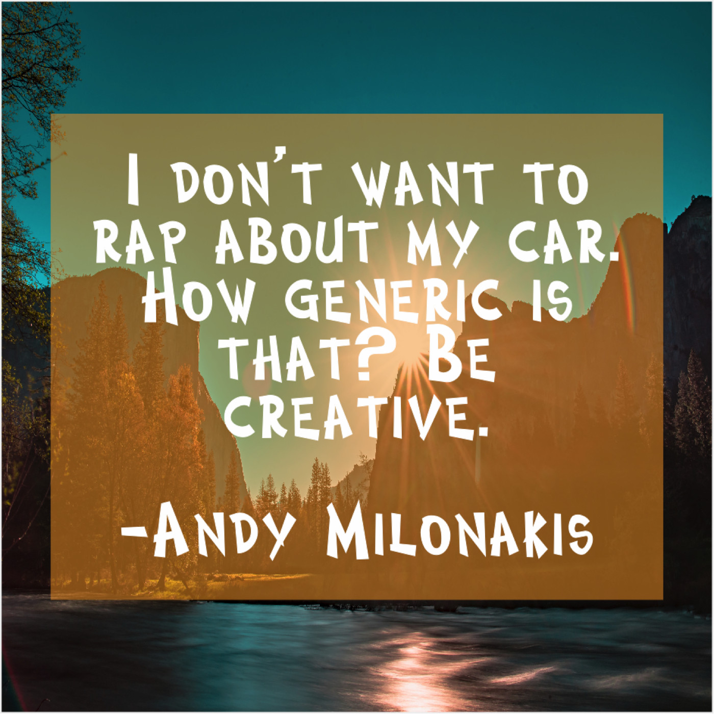 Andy Milonakis Andy Milonakis – I don’t want to rap… August 23, 2019 admin “I don’t want to rap about my car. How generic is that? Be creative.”-Andy Milonakis