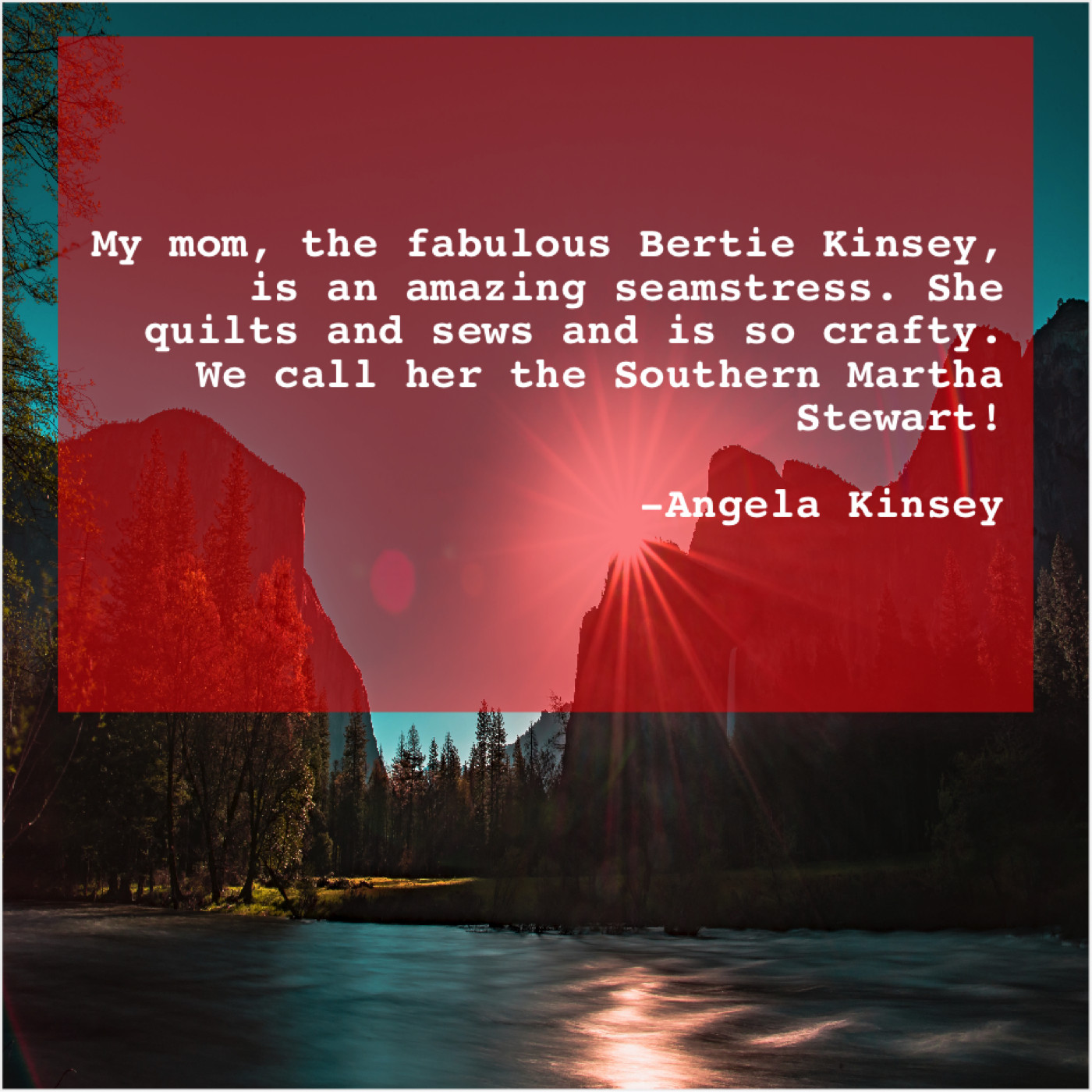 Angela Kinsey Angela Kinsey – My mom, the fabulous Bertie… January 5, 2019 admin “My mom, the fabulous Bertie Kinsey, is an amazing seamstress. She quilts and sews and is so crafty. We call her the Southern Martha Stewart!”-Angela Kinsey