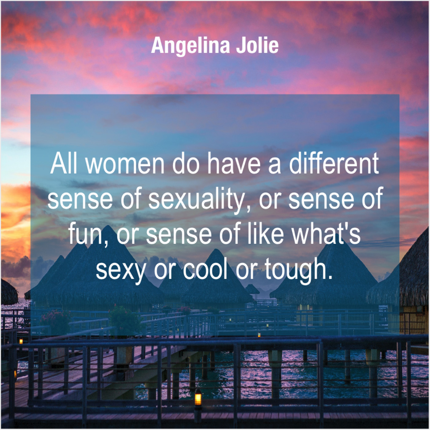Angelina Jolie Angelina Jolie – All women do have a… May 24, 2019 admin “All women do have a different sense of sexuality, or sense of fun, or sense of like what’s sexy or cool or tough.”-Angelina Jolie