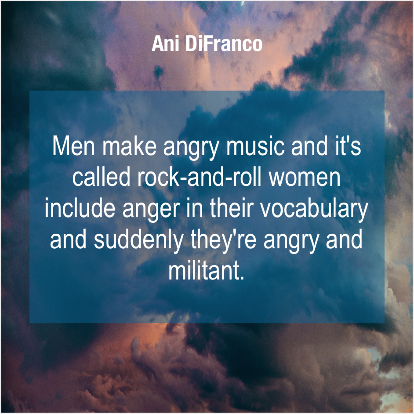 Ani DiFranco Ani DiFranco – Men make angry music and… July 2, 2019 admin “Men make angry music and it’s called rock-and-roll women include anger in their vocabulary and suddenly they’re angry and militant.”-Ani DiFranco
