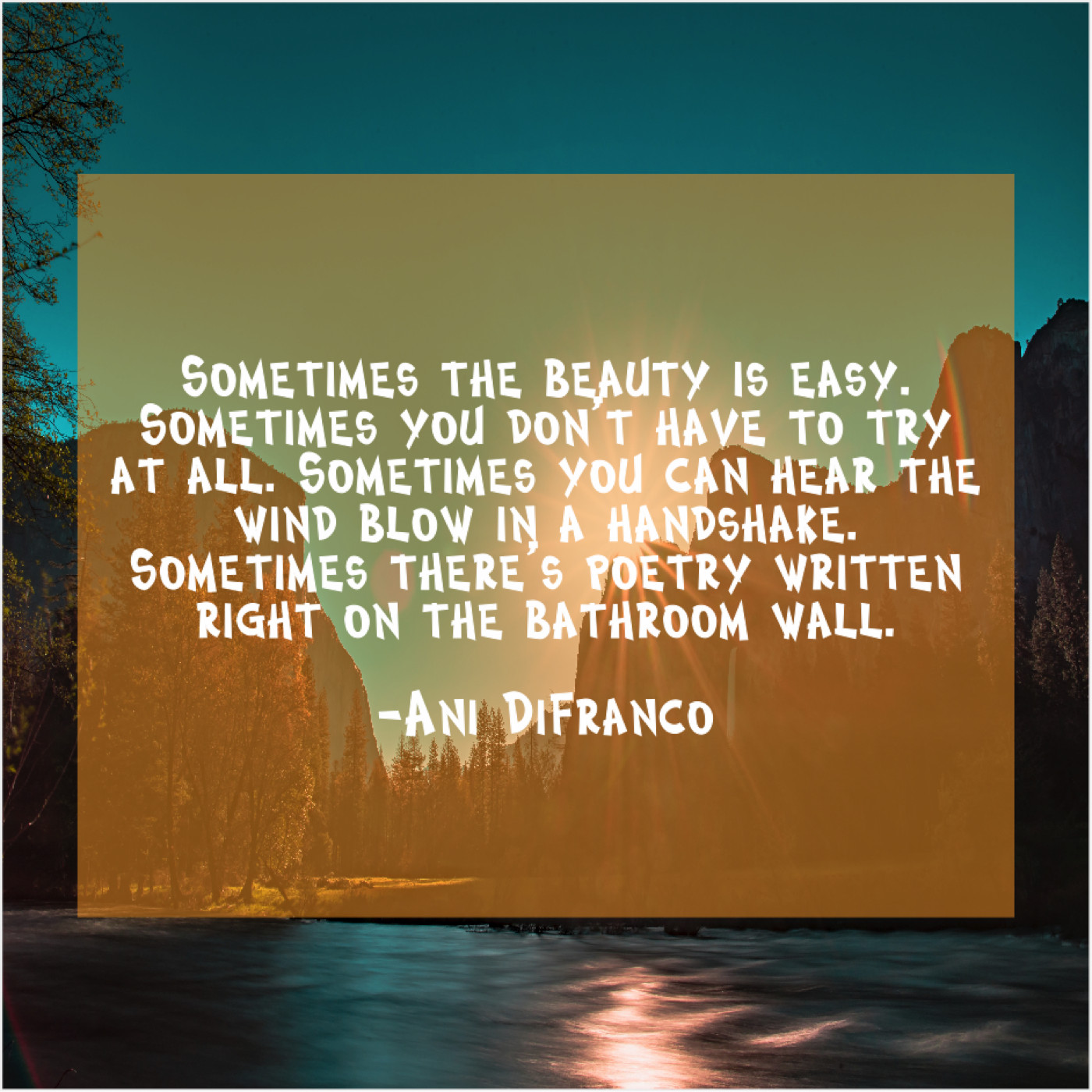 Ani DiFranco Ani DiFranco – Sometimes the beauty is easy… September 8, 2019 admin “Sometimes the beauty is easy. Sometimes you don’t have to try at all. Sometimes you can hear the wind blow in a handshake. Sometimes there’s poetry written right on the bathroom wall.”-Ani DiFranco