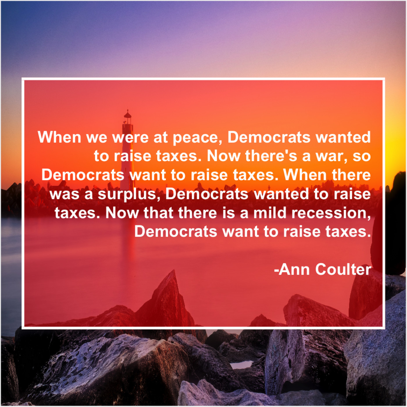 Ann Coulter Ann Coulter – When we were at peace… June 28, 2019 admin “When we were at peace, Democrats wanted to raise taxes. Now there’s a war, so Democrats want to raise taxes. When there was a surplus, Democrats wanted to raise taxes. Now that there is a mild recession, Democrats want to raise taxes.”-Ann Coulter