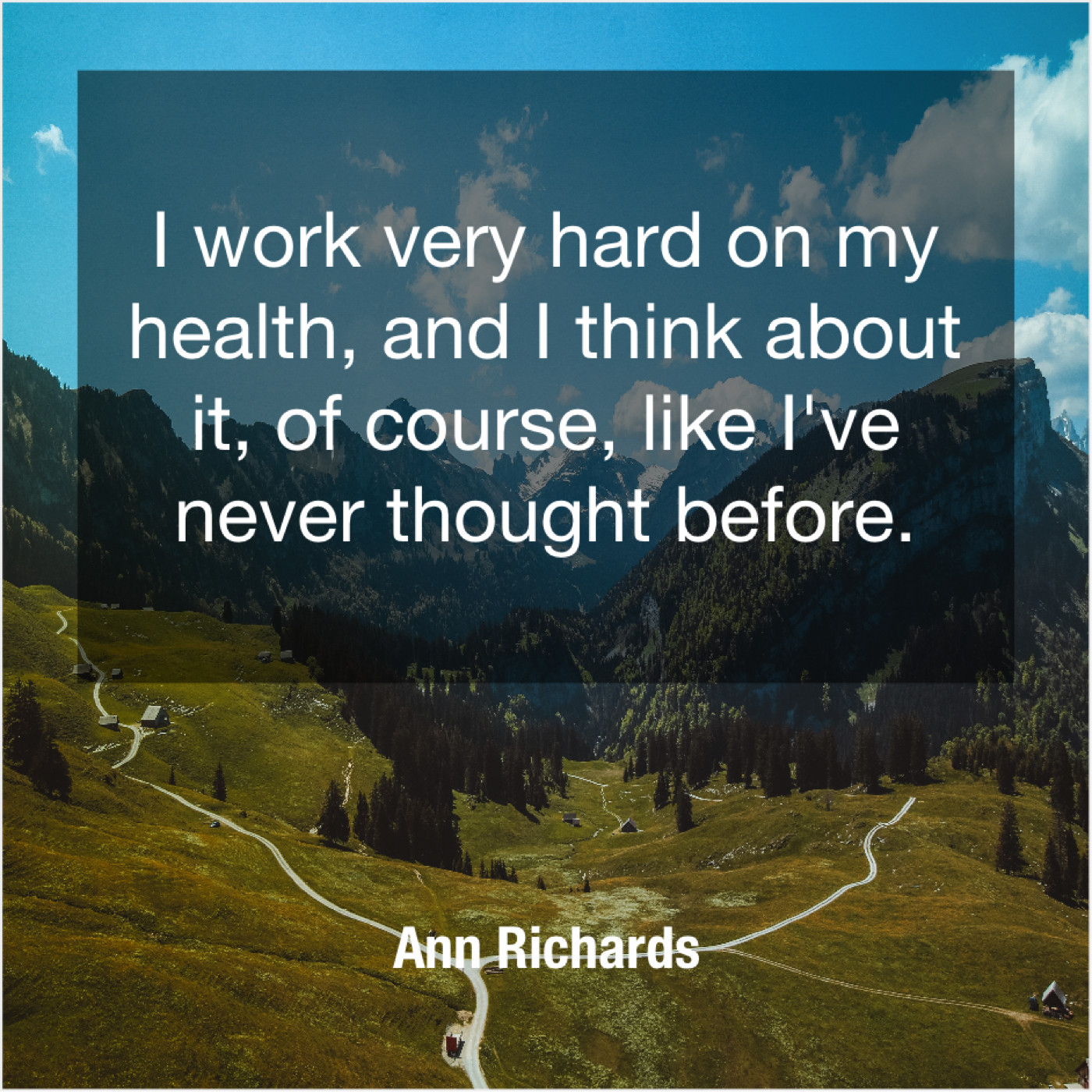 Ann Richards Ann Richards – I work very hard on… September 8, 2019 admin “I work very hard on my health, and I think about it, of course, like I’ve never thought before.”-Ann Richards