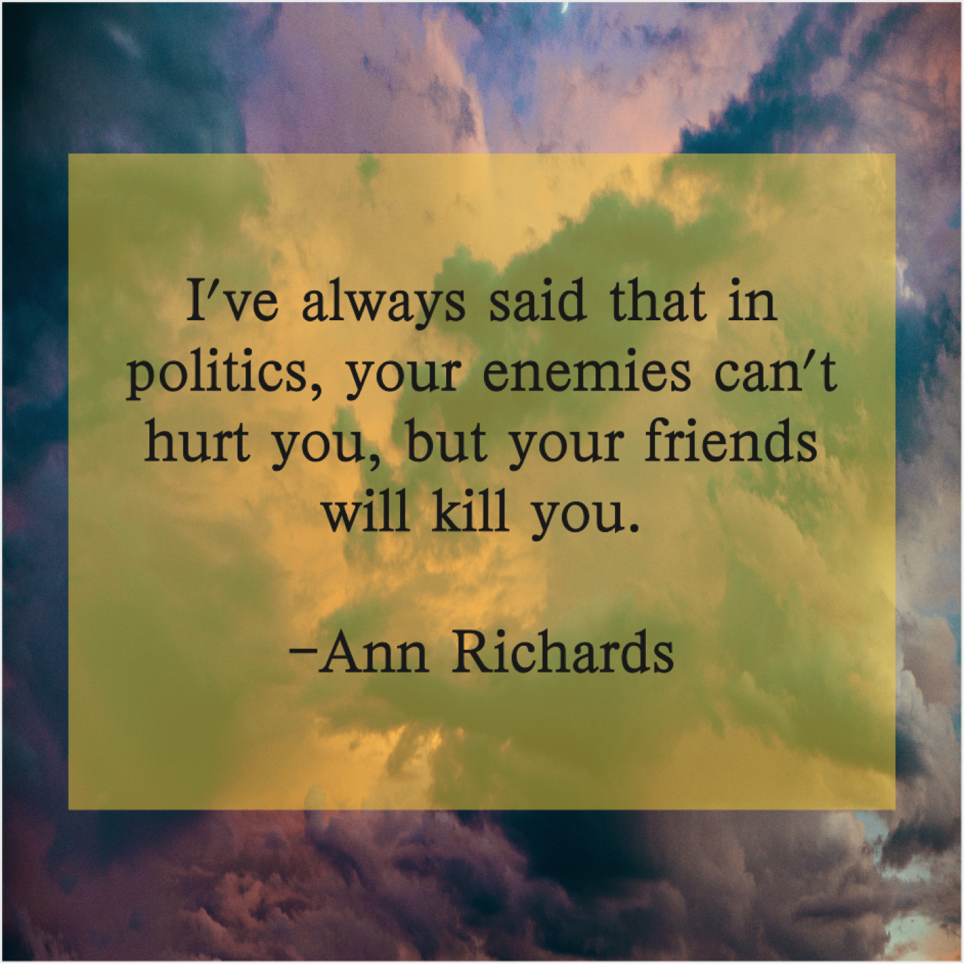 Ann Richards Ann Richards – I’ve always said that in… March 15, 2019 admin “I’ve always said that in politics, your enemies can’t hurt you, but your friends will kill you.”-Ann Richards