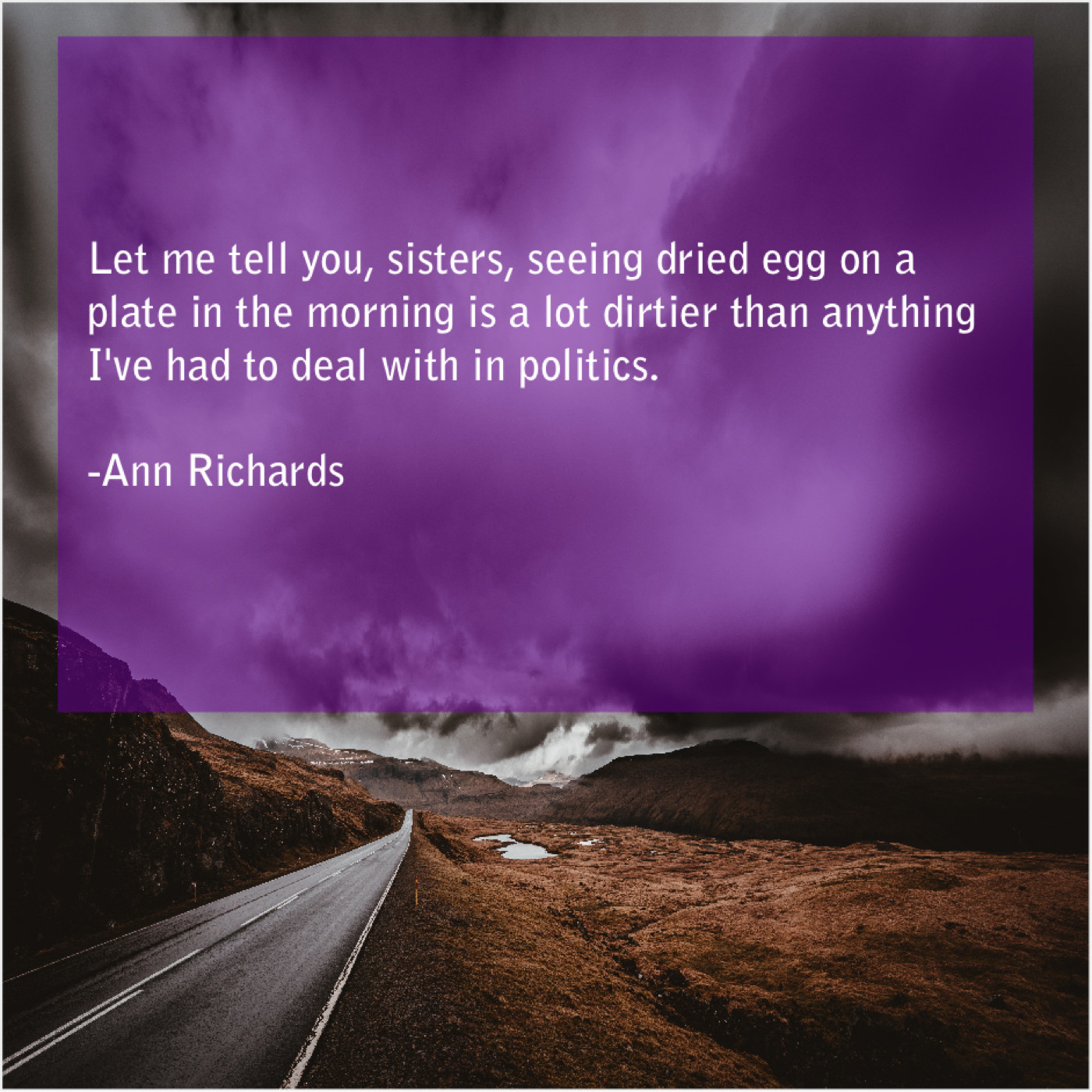 Ann Richards Ann Richards – Let me tell you, sisters… June 13, 2019 admin “Let me tell you, sisters, seeing dried egg on a plate in the morning is a lot dirtier than anything I’ve had to deal with in politics.”-Ann Richards