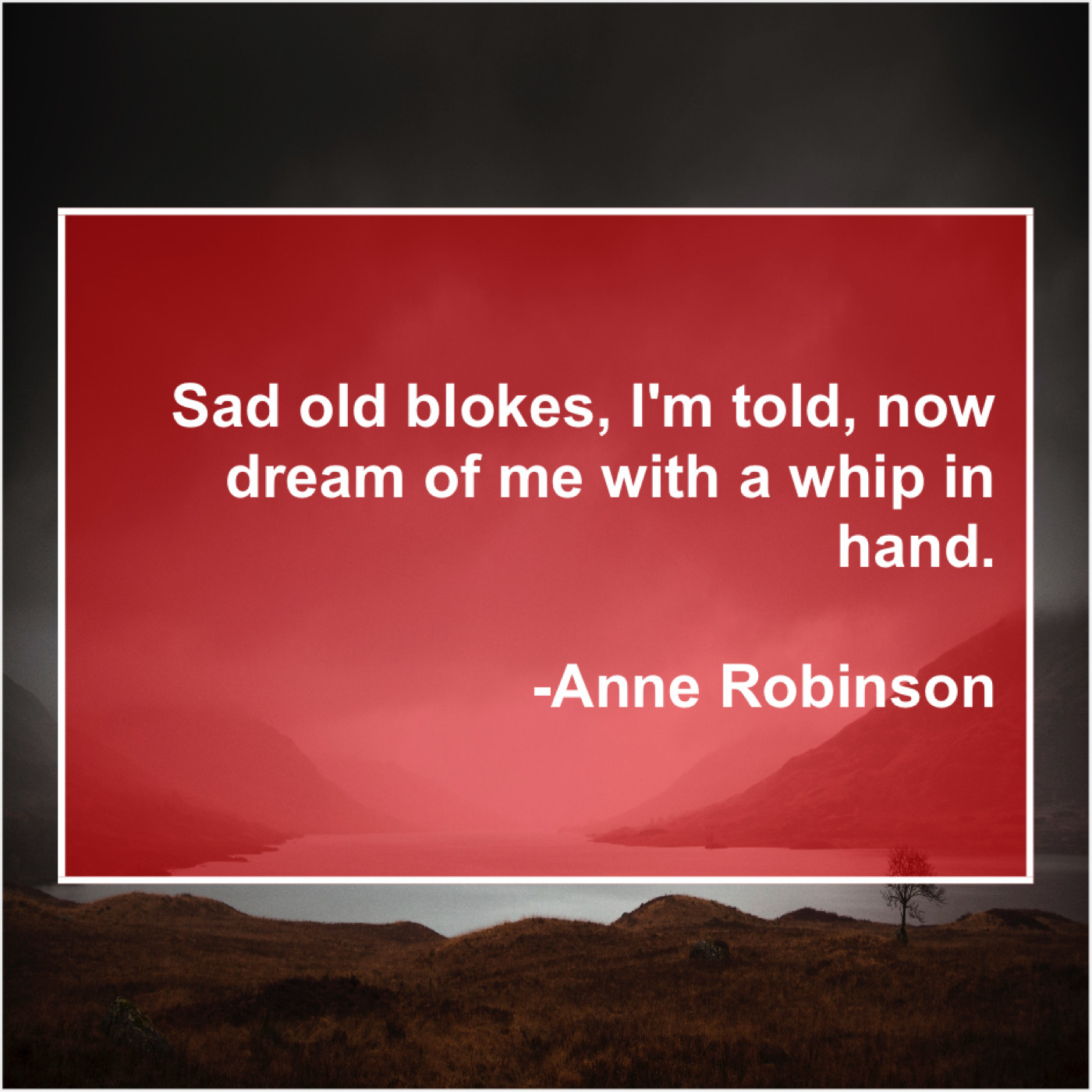Anne Robinson Anne Robinson – Sad old blokes, I’m told… October 21, 2019 admin “Sad old blokes, I’m told, now dream of me with a whip in hand.”-Anne Robinson