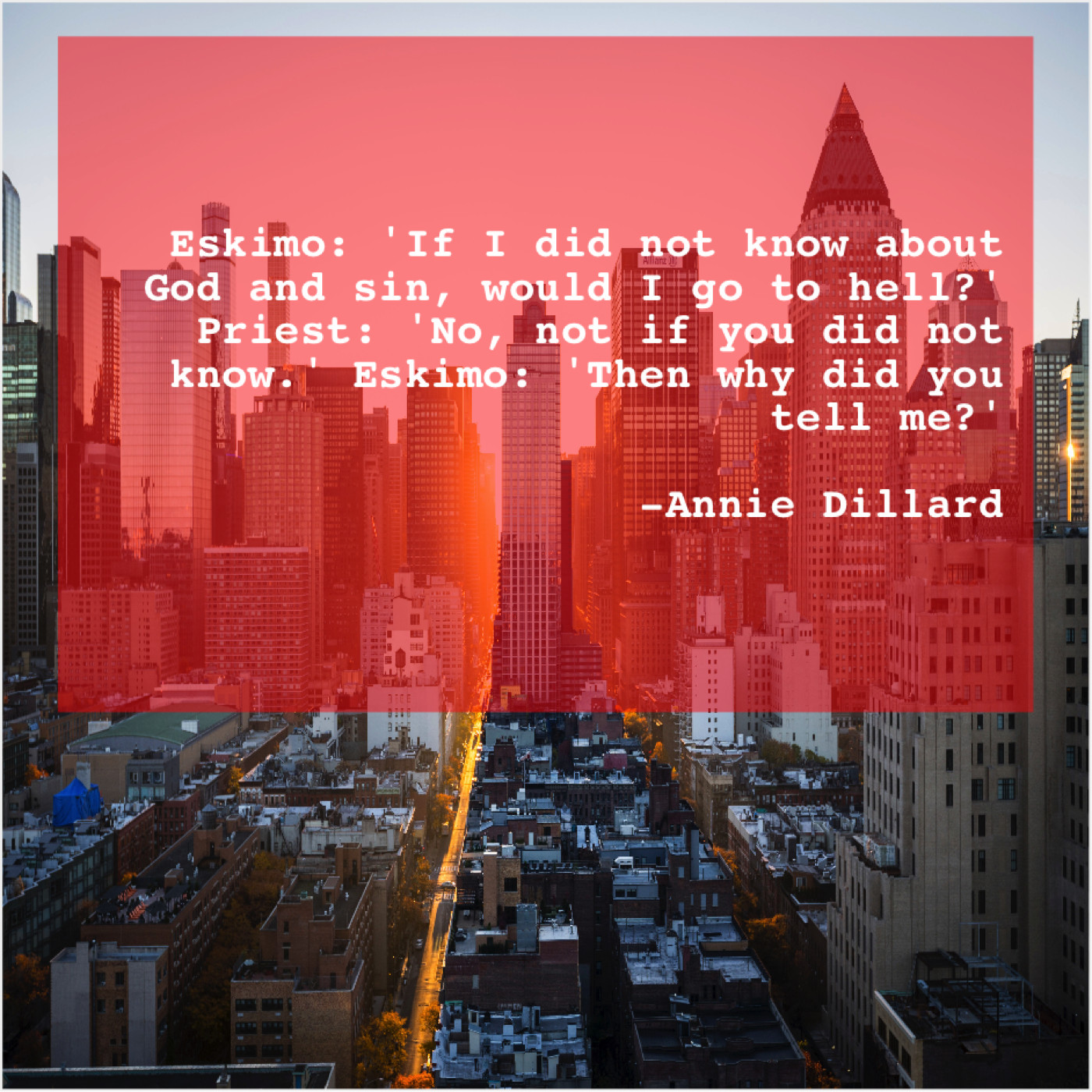 Annie Dillard Annie Dillard – Eskimo: ‘If I did not… June 19, 2019 admin “Eskimo: ‘If I did not know about God and sin, would I go to hell?’ Priest: ‘No, not if you did not know.’ Eskimo: ‘Then why did you tell me?'”-Annie Dillard