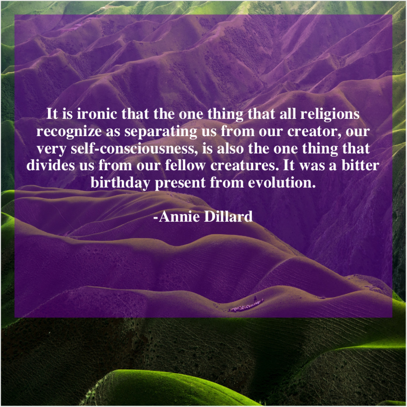 “It is ironic that the one thing that all religions recognize as separating us from our creator, our very self-consciousness, is also the one thing that divides us from our fellow creatures. It was a bitter birthday present from evolution.”
