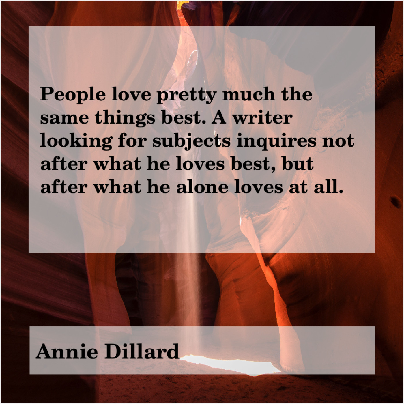 Annie Dillard Annie Dillard – People love pretty much the… November 4, 2018 admin “People love pretty much the same things best. A writer looking for subjects inquires not after what he loves best, but after what he alone loves at all.”-Annie Dillard