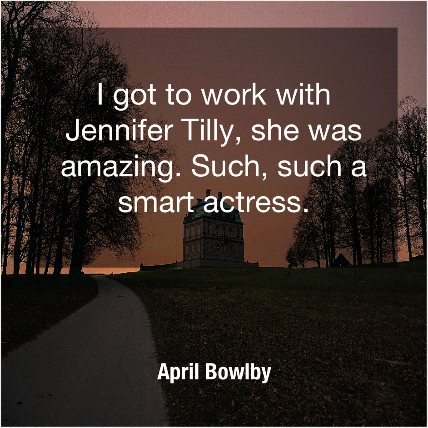 April Bowlby April Bowlby – I got to work with… March 19, 2019 admin “I got to work with Jennifer Tilly, she was amazing. Such, such a smart actress.”-April Bowlby