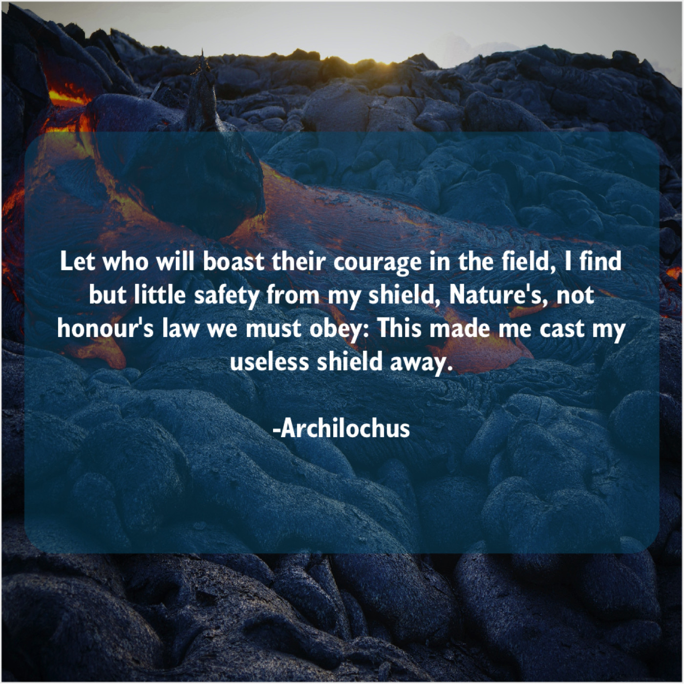 Archilochus Archilochus – Let who will boast their… July 27, 2019 admin “Let who will boast their courage in the field, I find but little safety from my shield, Nature’s, not honour’s law we must obey: This made me cast my useless shield away.”-Archilochus
