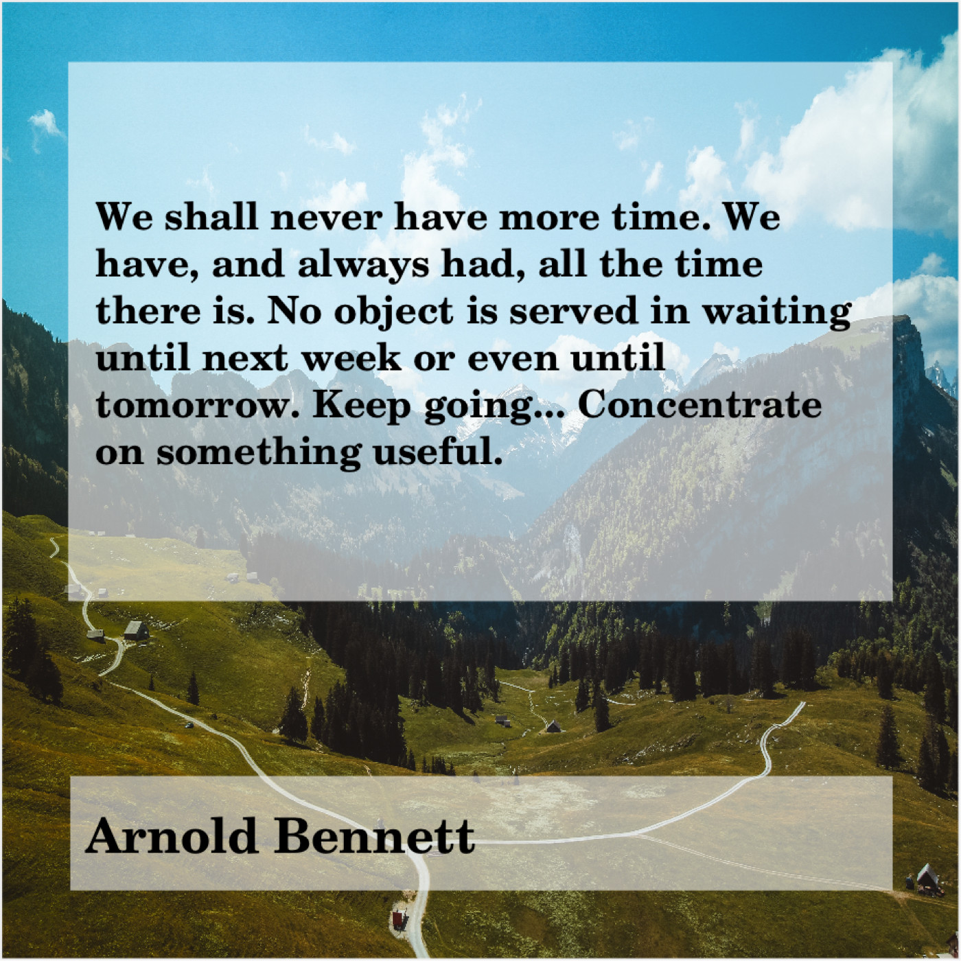 Arnold Bennett Arnold Bennett – We shall never have more… October 20, 2019 admin “We shall never have more time. We have, and always had, all the time there is. No object is served in waiting until next week or even until tomorrow. Keep going… Concentrate on something useful.”-Arnold Bennett