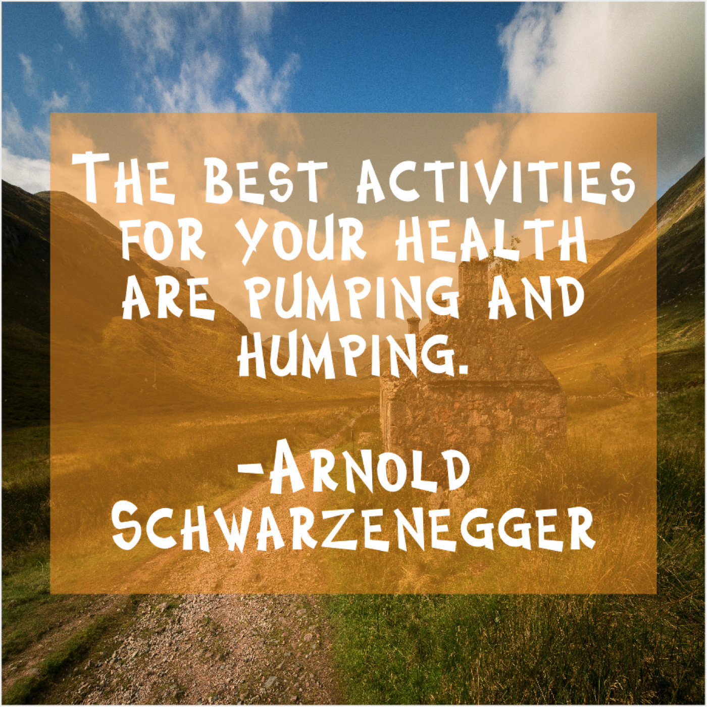 Arnold Schwarzenegger Arnold Schwarzenegger – The best activities for your… June 6, 2019 admin “The best activities for your health are pumping and humping.”-Arnold Schwarzenegger