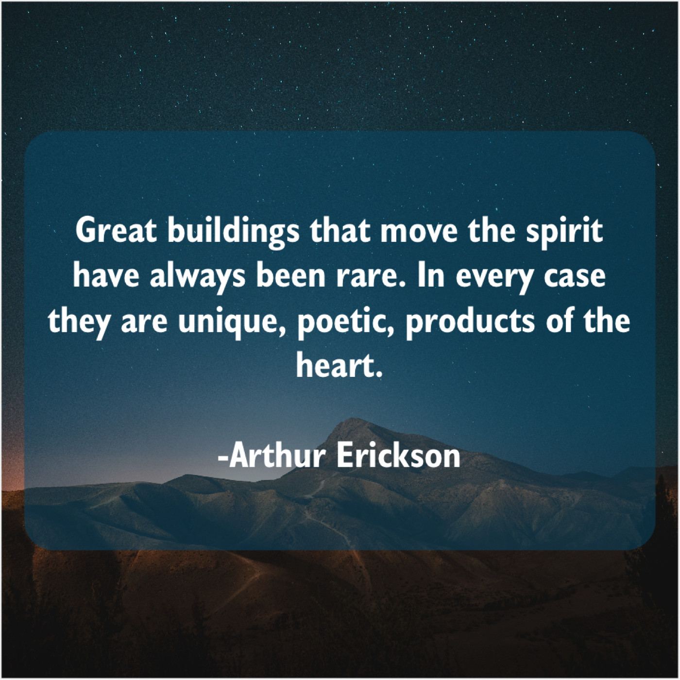 “Great buildings that move the spirit have always been rare. In every case they are unique, poetic, products of the heart.”