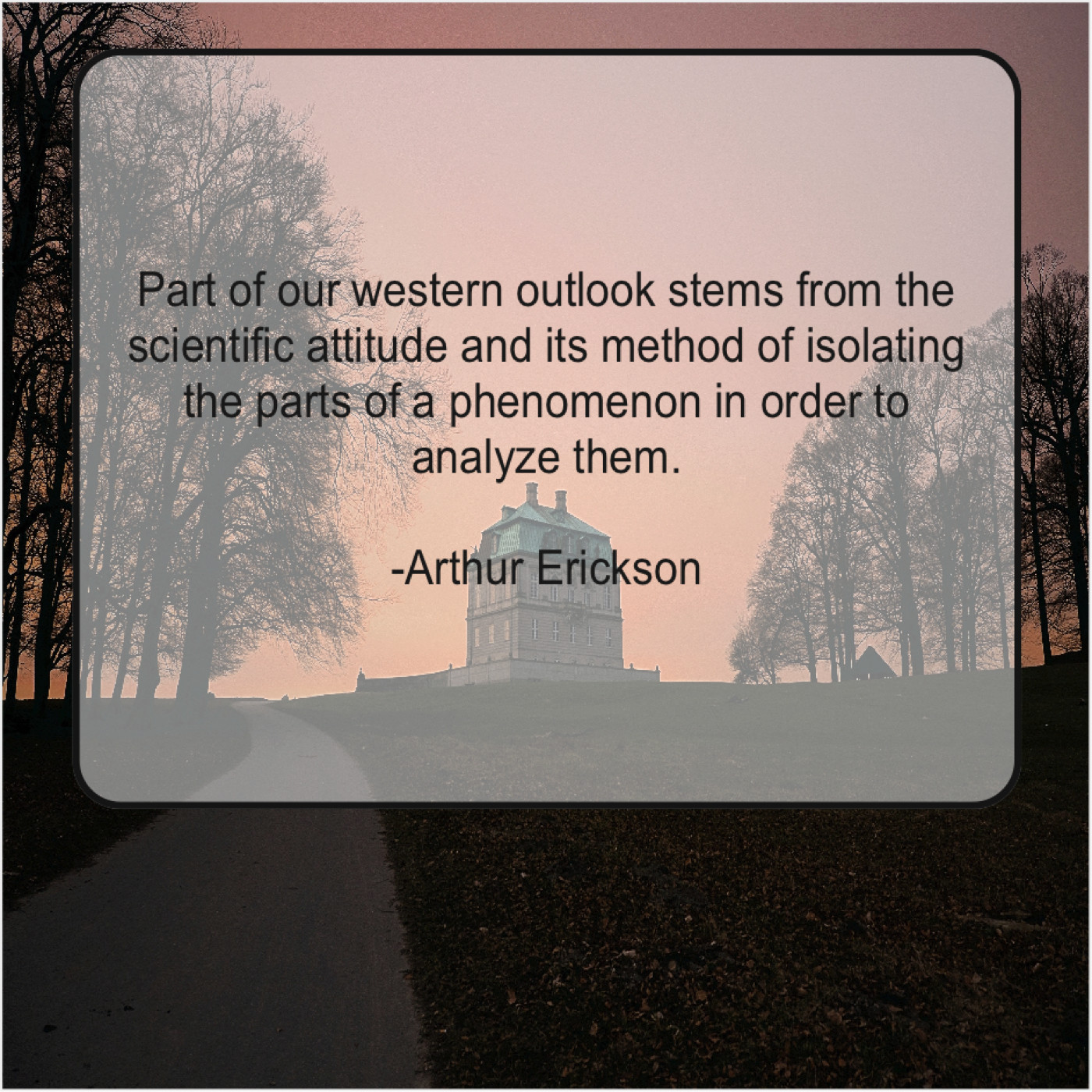Arthur Erickson Arthur Erickson – Part of our western outlook… May 28, 2019 admin “Part of our western outlook stems from the scientific attitude and its method of isolating the parts of a phenomenon in order to analyze them.”-Arthur Erickson