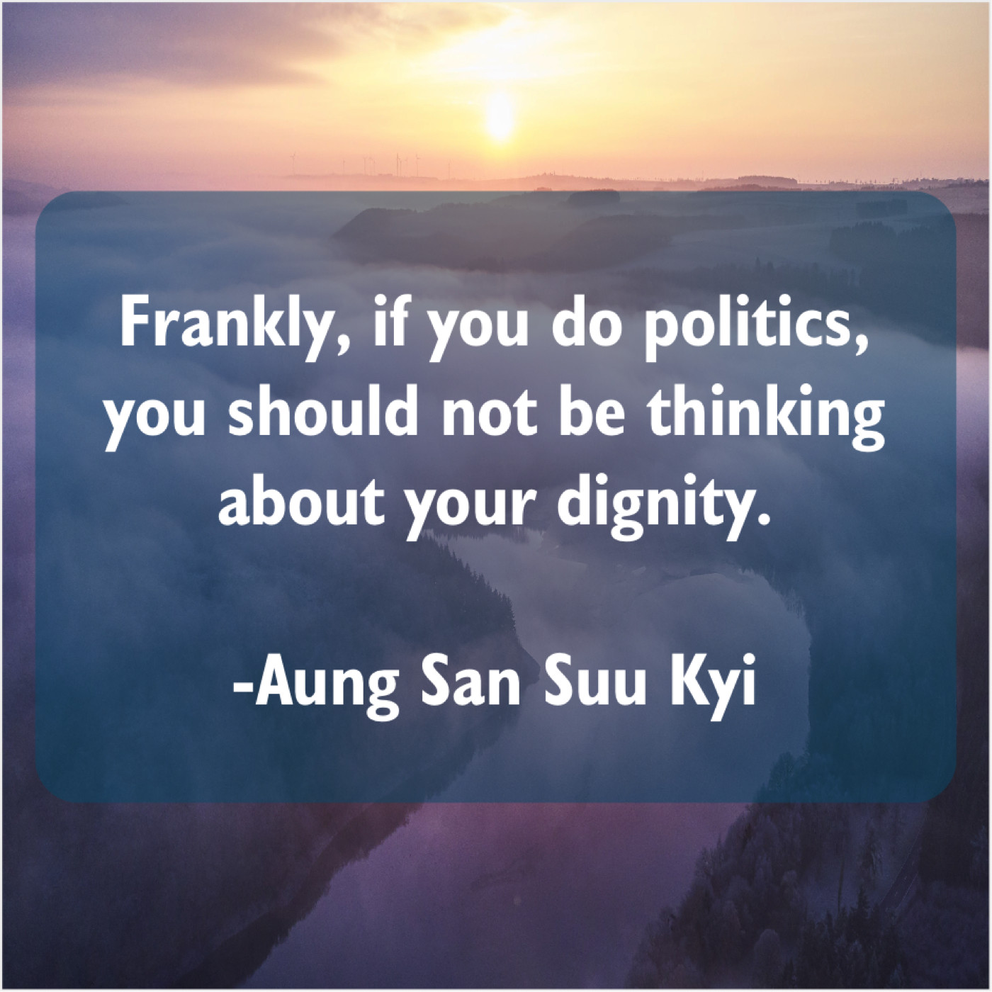 Aung San Suu Kyi Aung San Suu Kyi – Frankly, if you do politics… January 30, 2019 admin “Frankly, if you do politics, you should not be thinking about your dignity.”-Aung San Suu Kyi