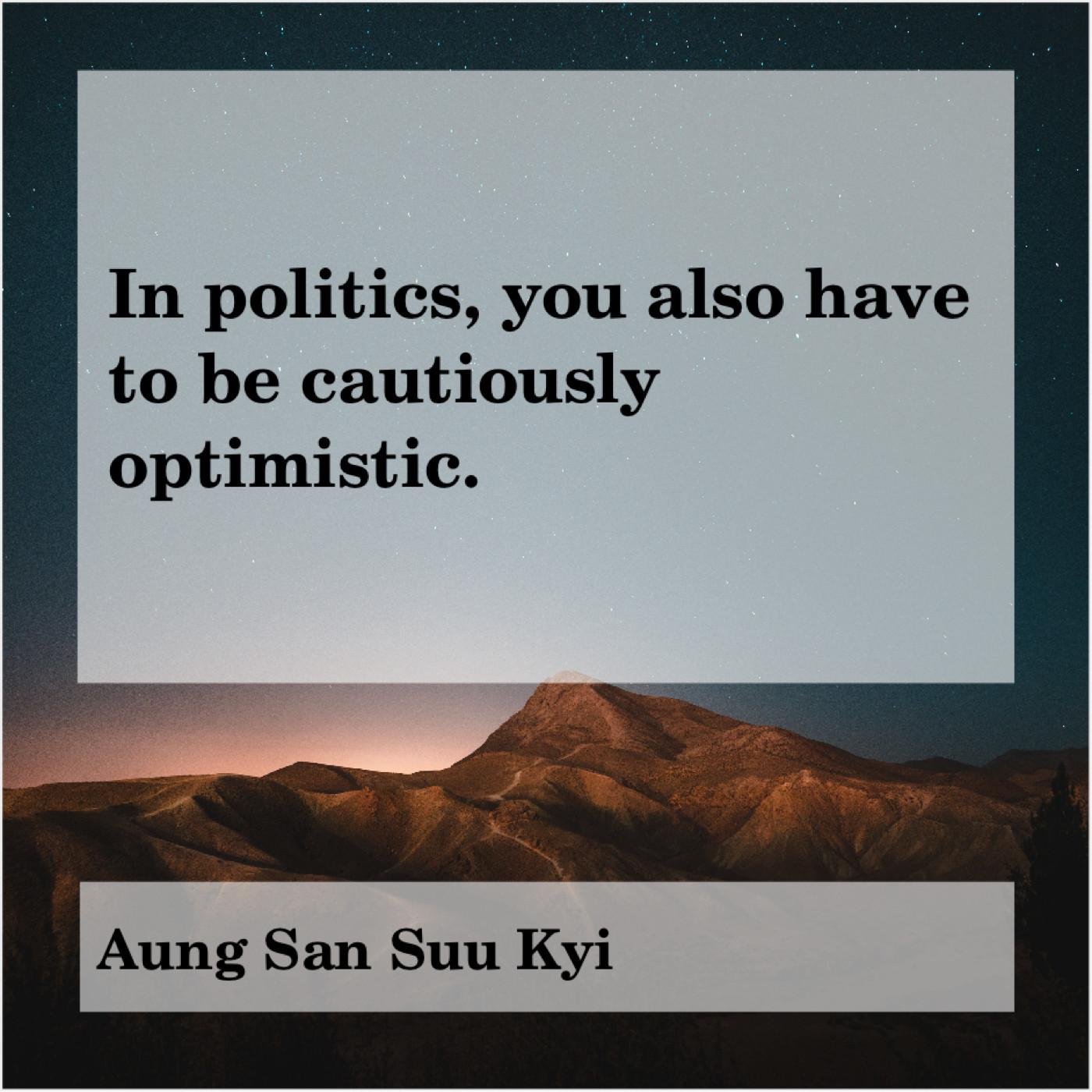 Aung San Suu Kyi Aung San Suu Kyi – In politics, you also have… July 14, 2019 admin “In politics, you also have to be cautiously optimistic.”-Aung San Suu Kyi