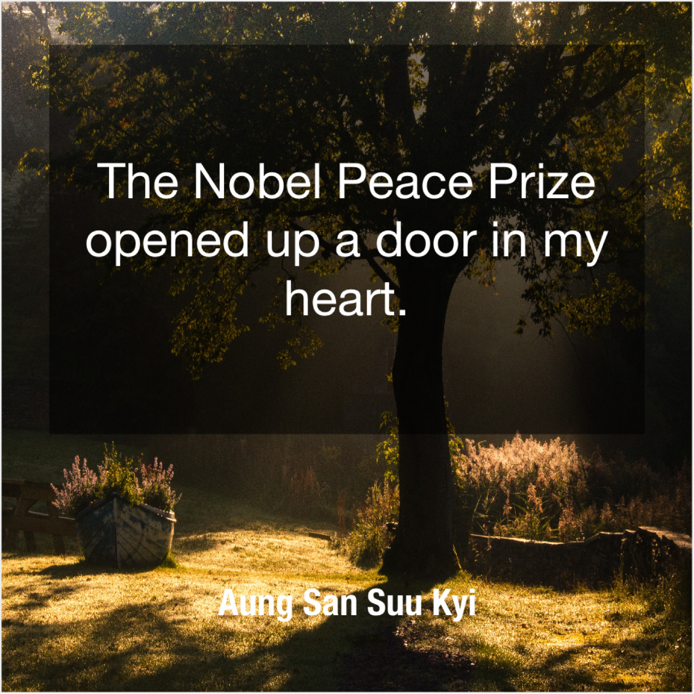 Aung San Suu Kyi Aung San Suu Kyi – The Nobel Peace Prize opened… September 8, 2019 admin “The Nobel Peace Prize opened up a door in my heart.”-Aung San Suu Kyi