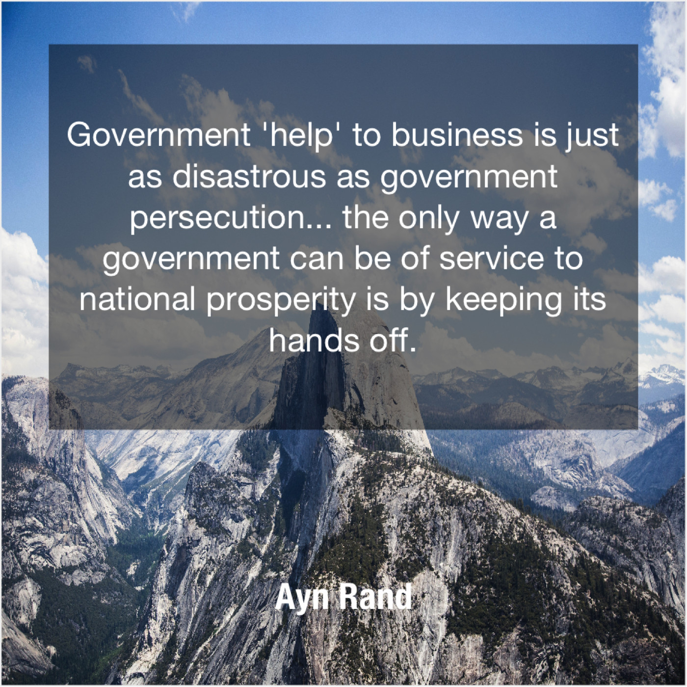 Ayn Rand Ayn Rand – Government ‘help’ to business is… May 5, 2019 admin “Government ‘help’ to business is just as disastrous as government persecution… the only way a government can be of service to national prosperity is by keeping its hands off.”-Ayn Rand