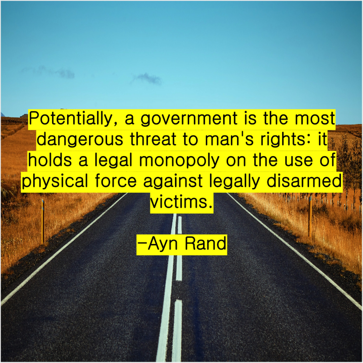 Ayn Rand Ayn Rand – Potentially, a government is the… June 27, 2019 admin “Potentially, a government is the most dangerous threat to man’s rights: it holds a legal monopoly on the use of physical force against legally disarmed victims.”-Ayn Rand