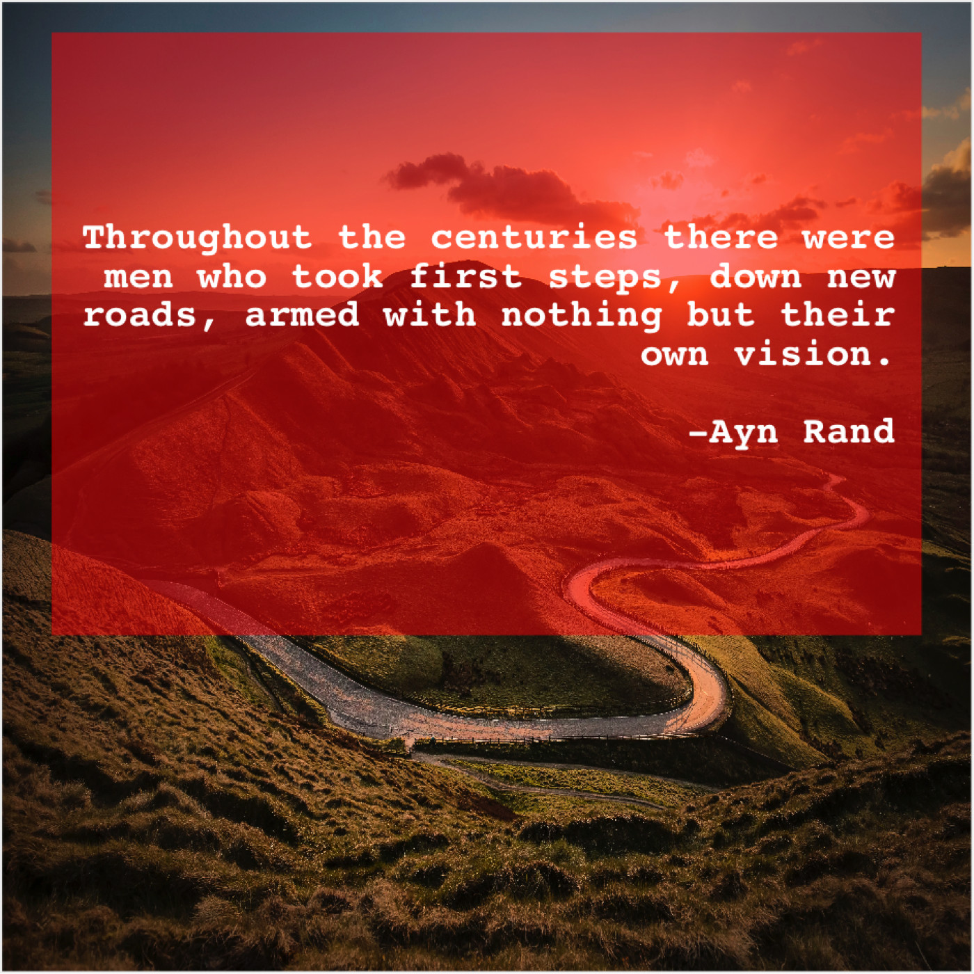 Ayn Rand Ayn Rand – Throughout the centuries there were… August 27, 2019 admin “Throughout the centuries there were men who took first steps, down new roads, armed with nothing but their own vision.”-Ayn Rand