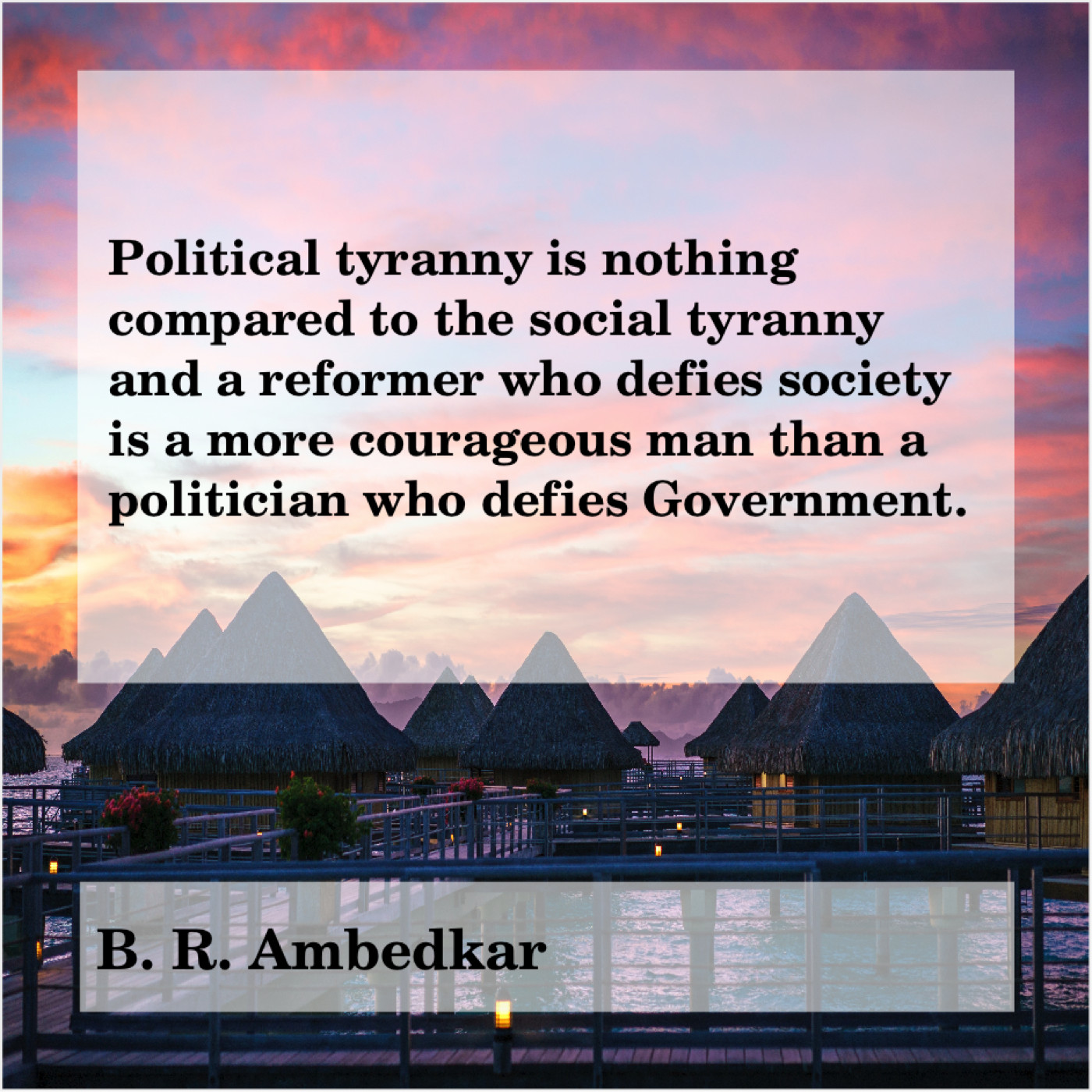 B. R. Ambedkar B. R. Ambedkar – Political tyranny is nothing compared… August 4, 2019 admin “Political tyranny is nothing compared to the social tyranny and a reformer who defies society is a more courageous man than a politician who defies Government.”-B. R. Ambedkar