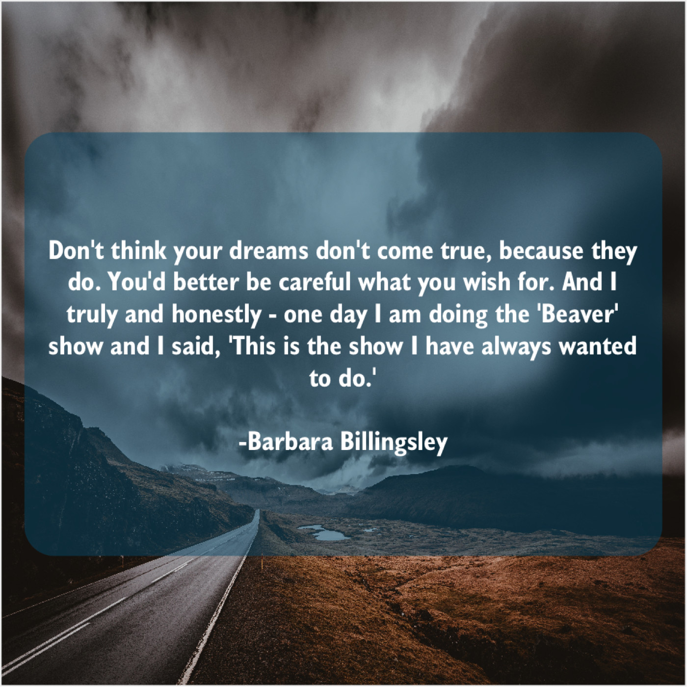Barbara Billingsley Barbara Billingsley – Don’t think your dreams don’t… August 7, 2019 admin “Don’t think your dreams don’t come true, because they do. You’d better be careful what you wish for. And I truly and honestly – one day I am doing the ‘Beaver’ show and I said, ‘This is the show I have always wanted to do.'”-Barbara Billingsley