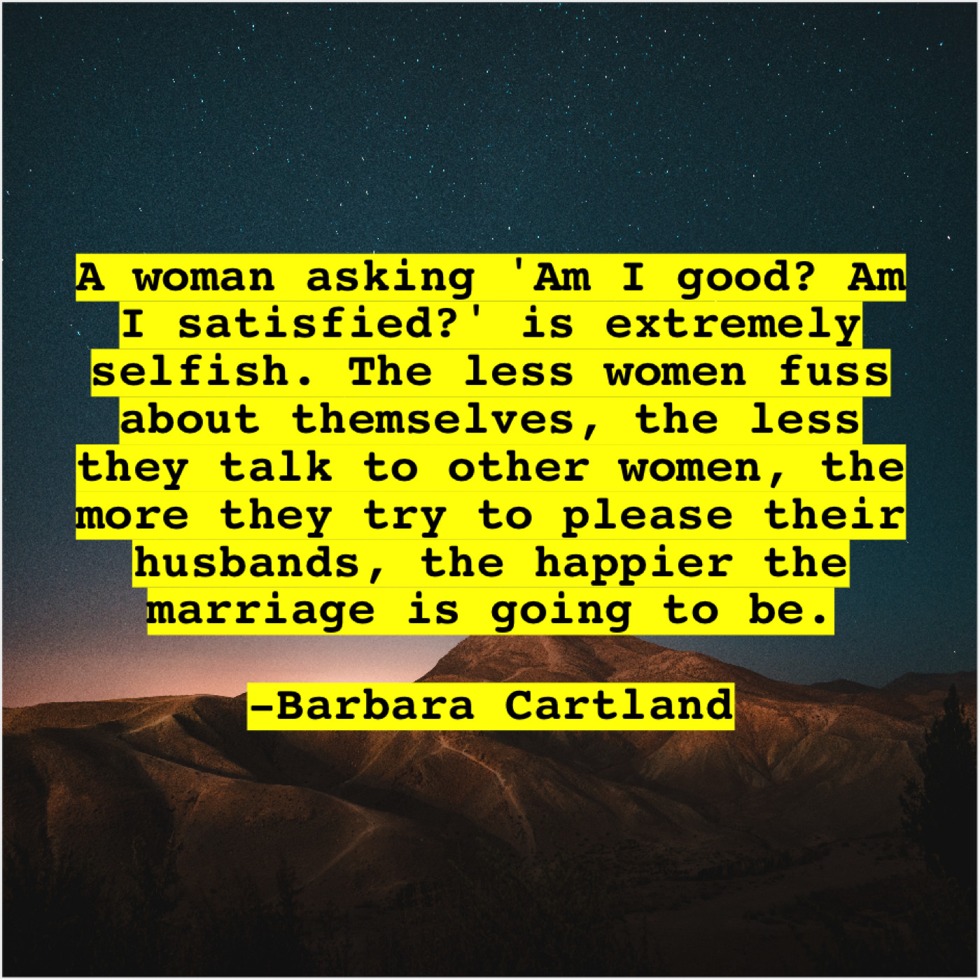 Barbara Cartland Barbara Cartland – A woman asking ‘Am I… April 16, 2019 admin “A woman asking ‘Am I good? Am I satisfied?’ is extremely selfish. The less women fuss about themselves, the less they talk to other women, the more they try to please their husbands, the happier the marriage is going to be.”-Barbara Cartland