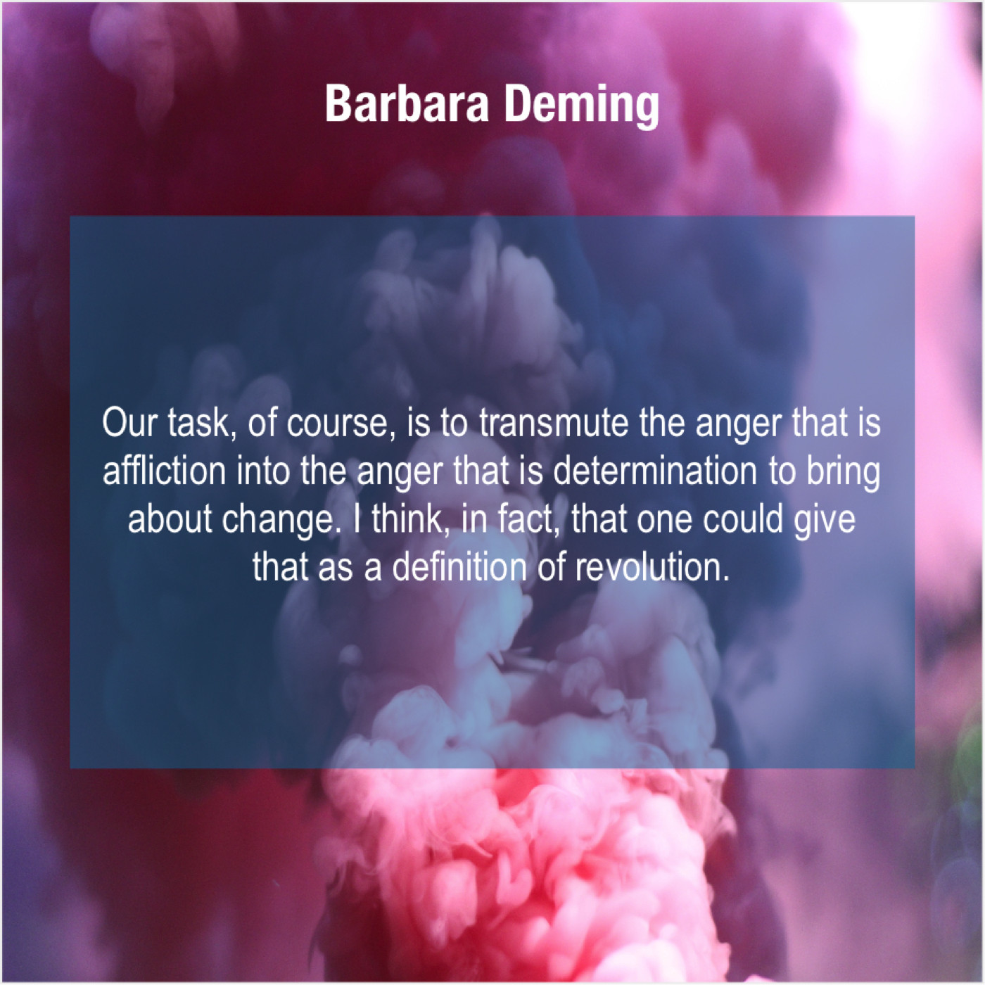 Barbara Deming Barbara Deming – Our task, of course, is… October 18, 2019 admin “Our task, of course, is to transmute the anger that is affliction into the anger that is determination to bring about change. I think, in fact, that one could give that as a definition of revolution.”-Barbara Deming
