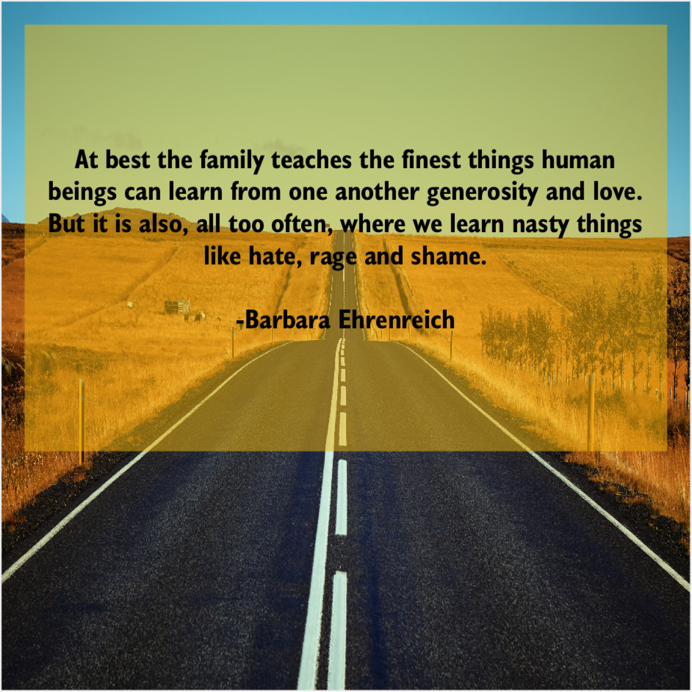 Barbara Ehrenreich Barbara Ehrenreich – At best the family teaches… October 4, 2019 admin “At best the family teaches the finest things human beings can learn from one another generosity and love. But it is also, all too often, where we learn nasty things like hate, rage and shame.”-Barbara Ehrenreich
