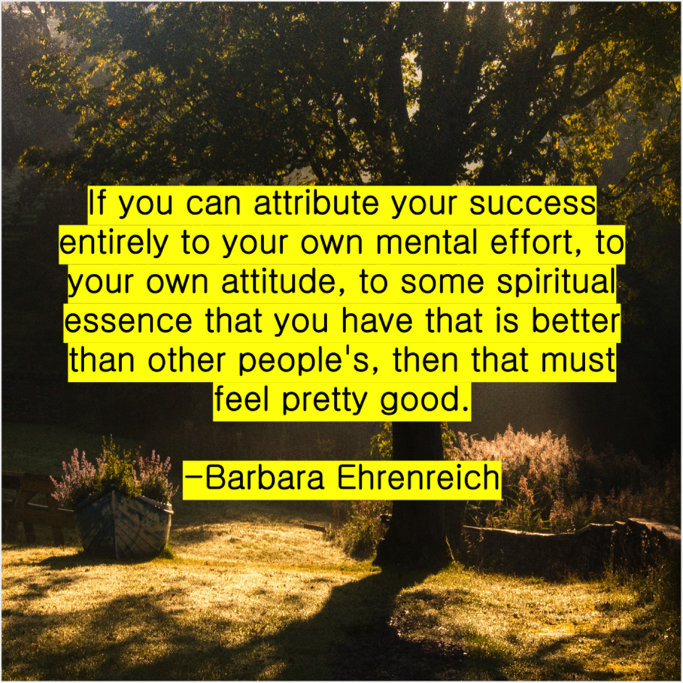 Barbara Ehrenreich Barbara Ehrenreich – If you can attribute your… April 28, 2019 admin “If you can attribute your success entirely to your own mental effort, to your own attitude, to some spiritual essence that you have that is better than other people’s, then that must feel pretty good.”-Barbara Ehrenreich