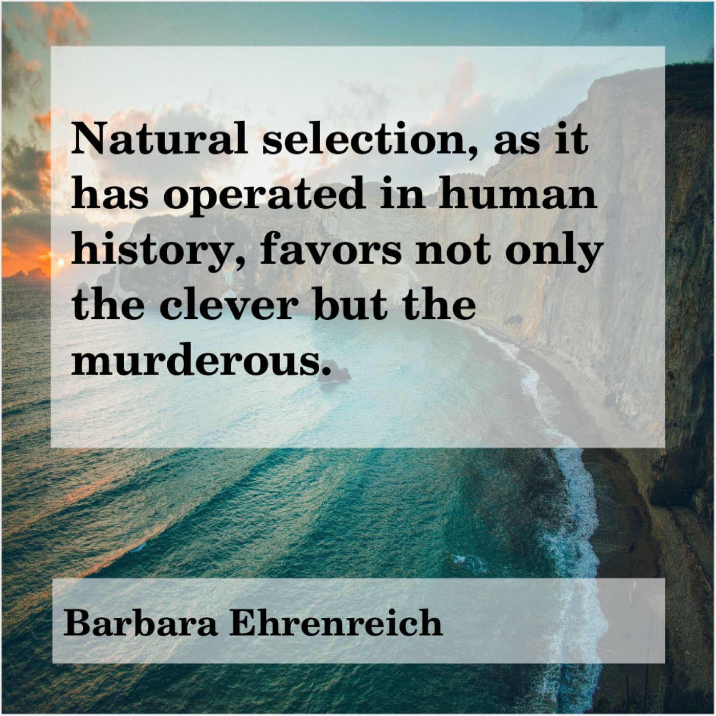 Barbara Ehrenreich Barbara Ehrenreich – Natural selection, as it has… June 1, 2019 admin “Natural selection, as it has operated in human history, favors not only the clever but the murderous.”-Barbara Ehrenreich