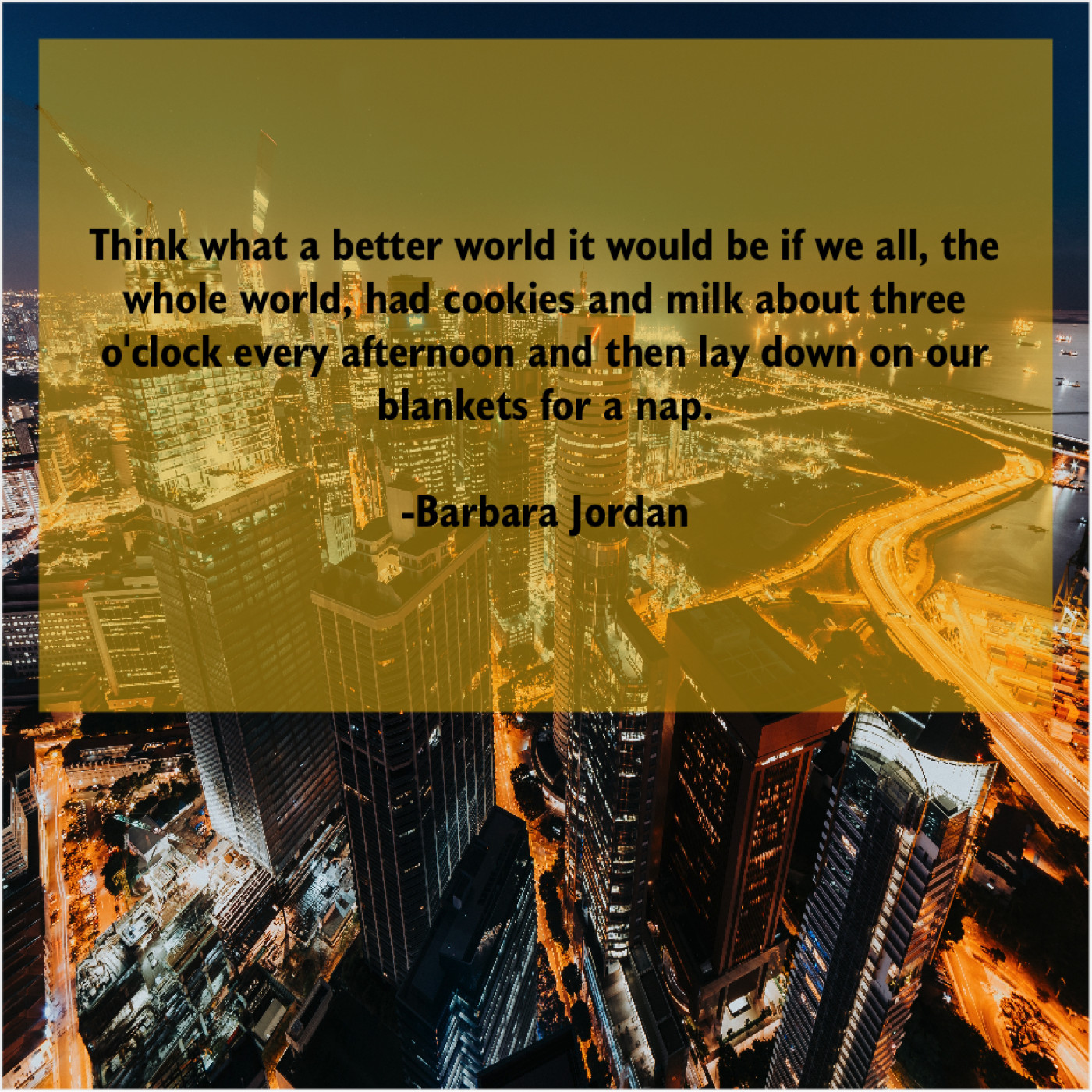 Barbara Jordan Barbara Jordan – Think what a better world… September 13, 2019 admin “Think what a better world it would be if we all, the whole world, had cookies and milk about three o’clock every afternoon and then lay down on our blankets for a nap.”-Barbara Jordan