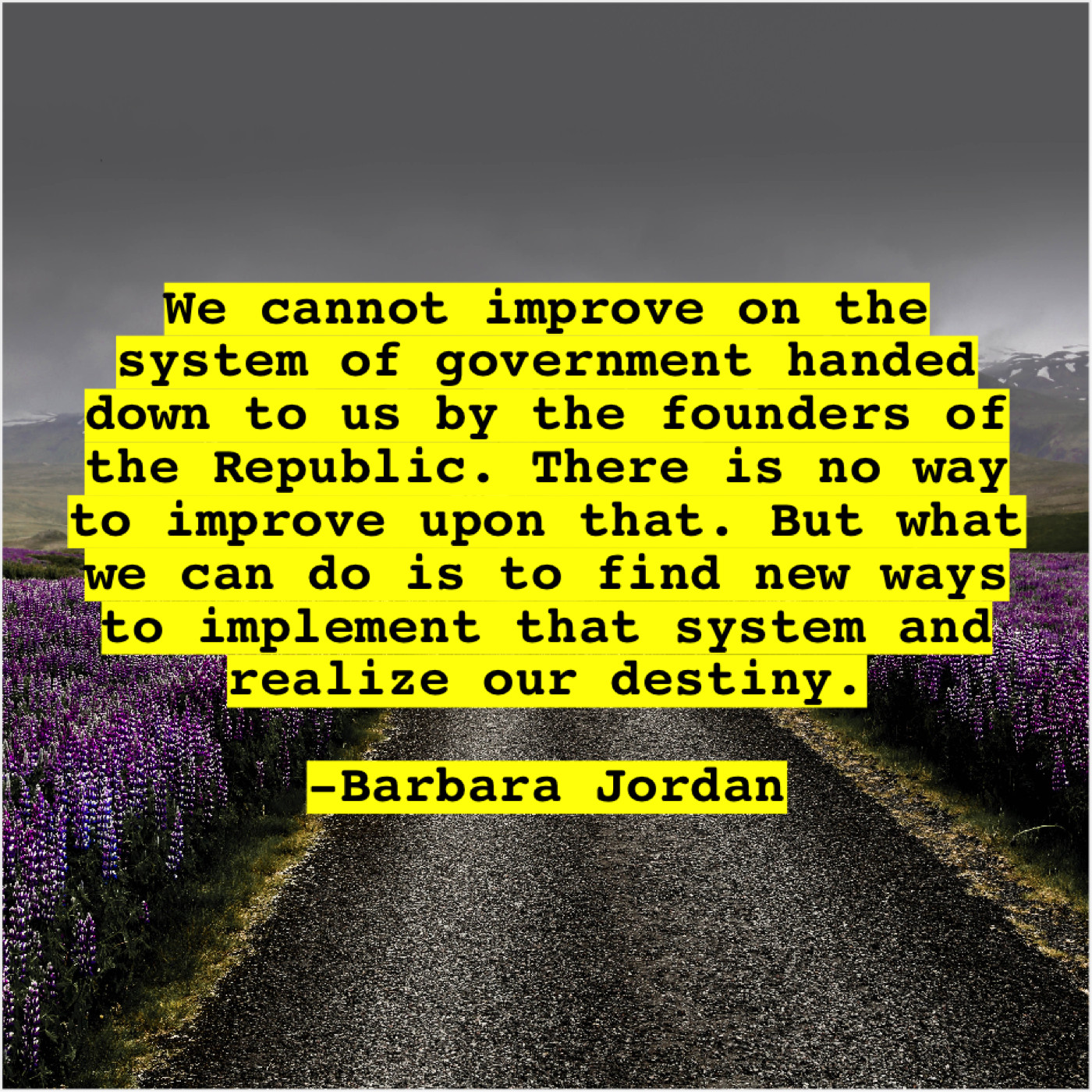 Barbara Jordan Barbara Jordan – We cannot improve on the… March 21, 2019 admin “We cannot improve on the system of government handed down to us by the founders of the Republic. There is no way to improve upon that. But what we can do is to find new ways to implement that system and realize our destiny.”-Barbara Jordan