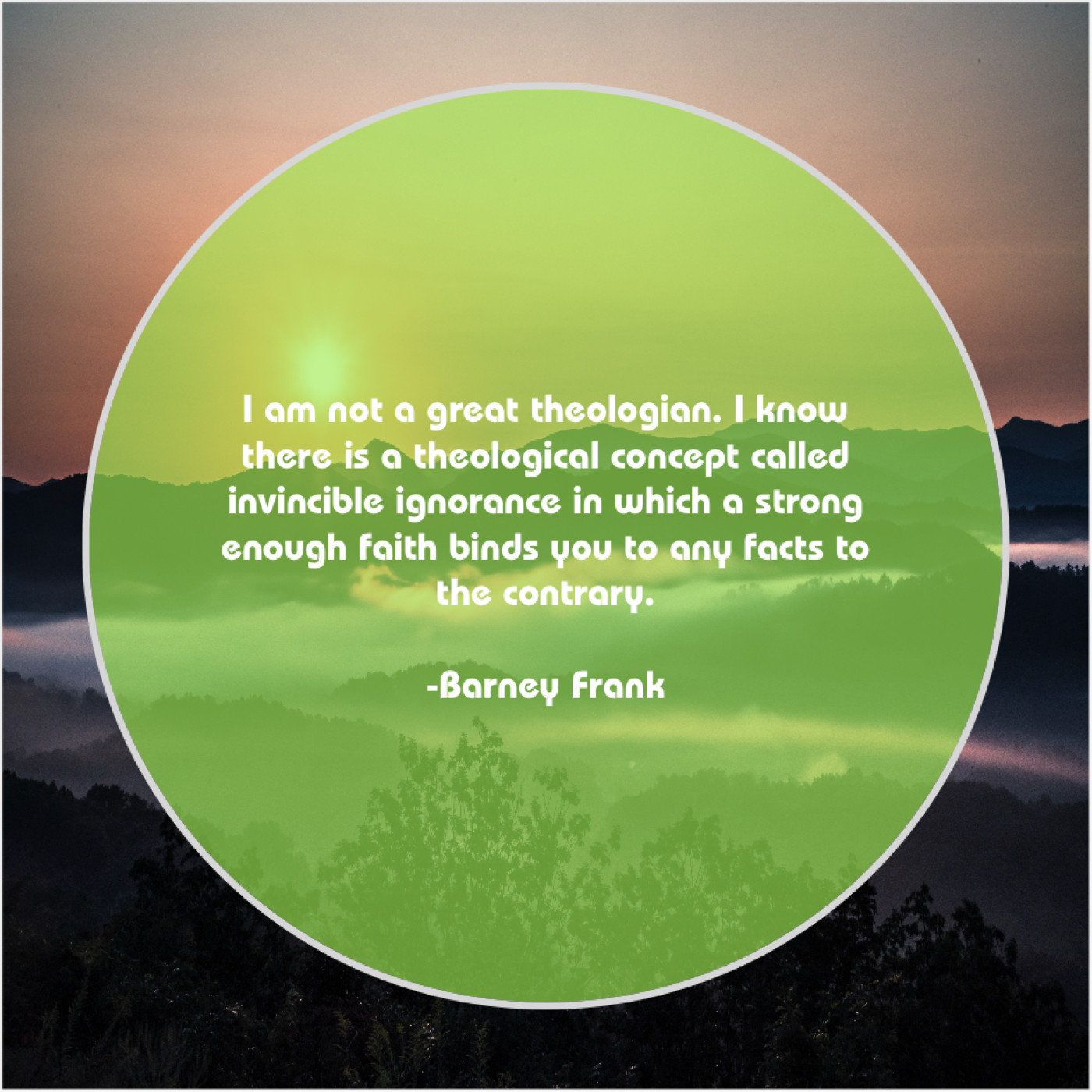 Barney Frank Barney Frank – I am not a great… November 24, 2018 admin “I am not a great theologian. I know there is a theological concept called invincible ignorance in which a strong enough faith binds you to any facts to the contrary.”-Barney Frank
