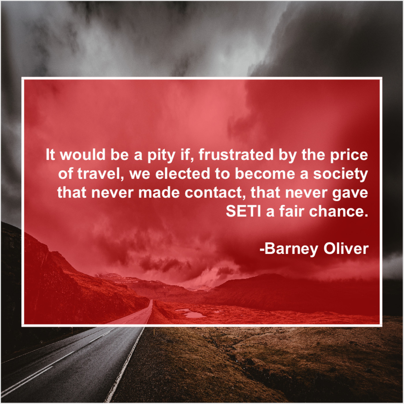 Barney Oliver Barney Oliver – It would be a pity… August 1, 2019 admin “It would be a pity if, frustrated by the price of travel, we elected to become a society that never made contact, that never gave SETI a fair chance.”-Barney Oliver