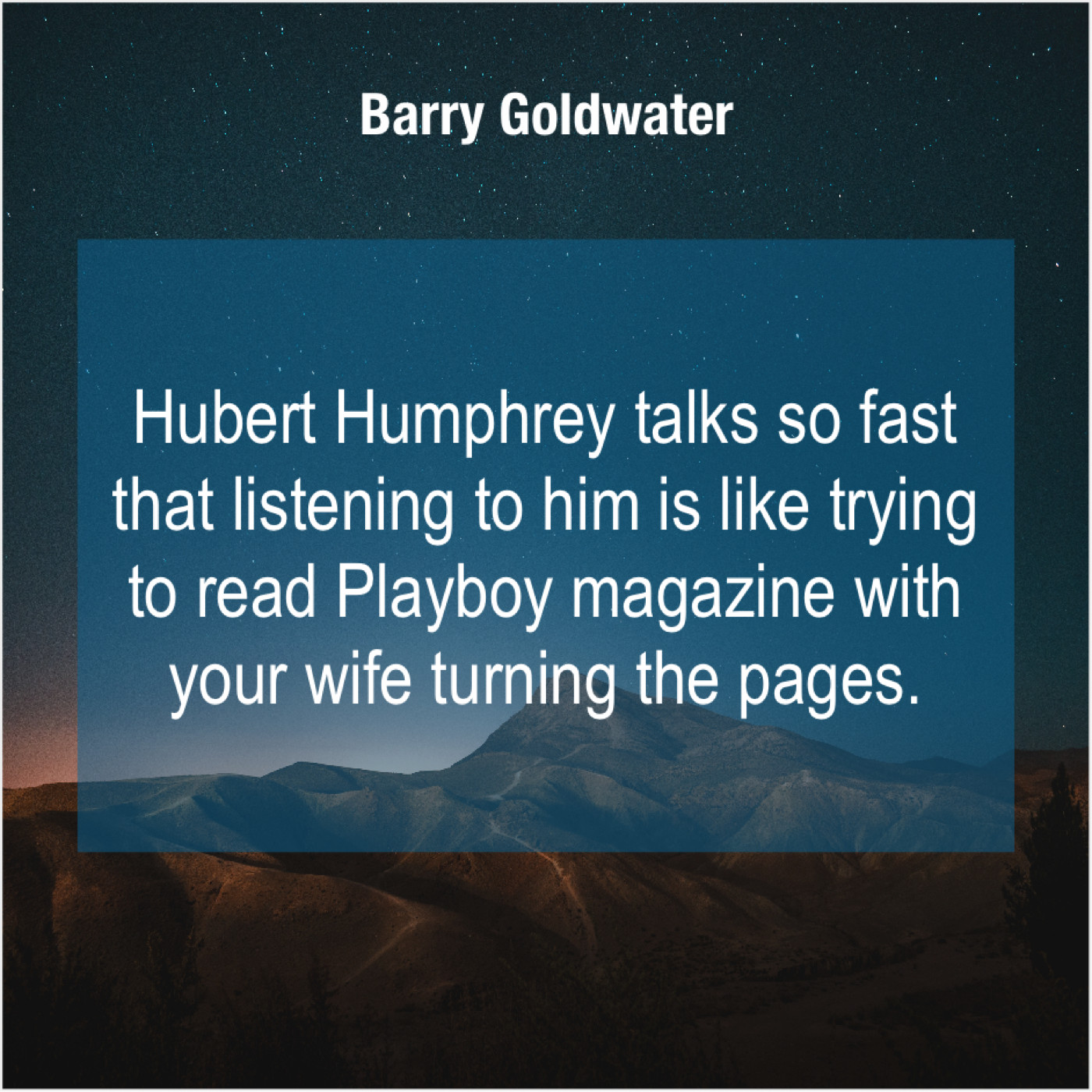 Barry Goldwater Barry Goldwater – Hubert Humphrey talks so fast… April 6, 2019 admin “Hubert Humphrey talks so fast that listening to him is like trying to read Playboy magazine with your wife turning the pages.”-Barry Goldwater